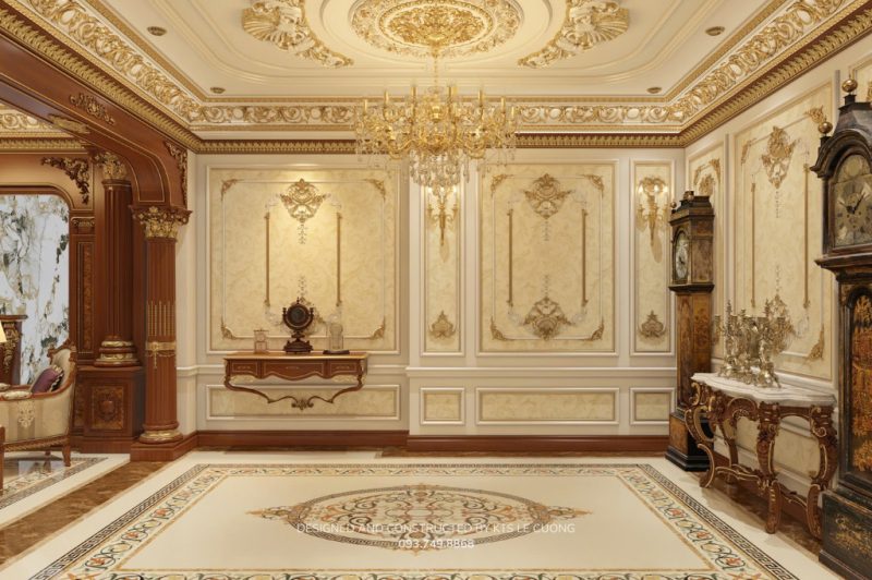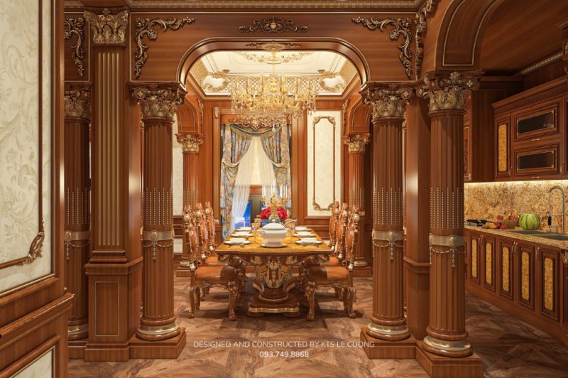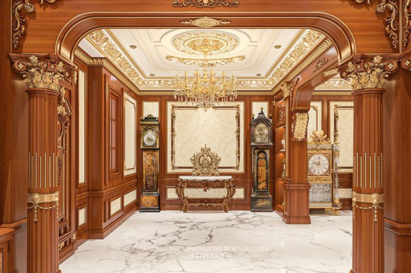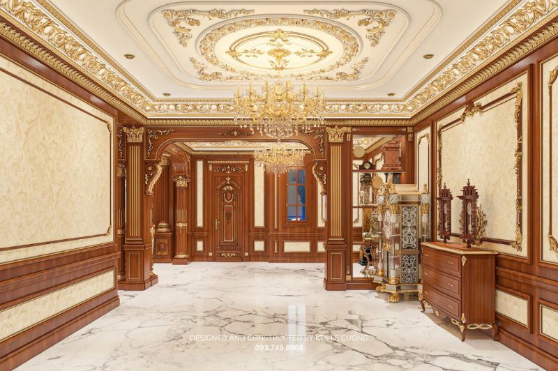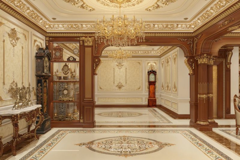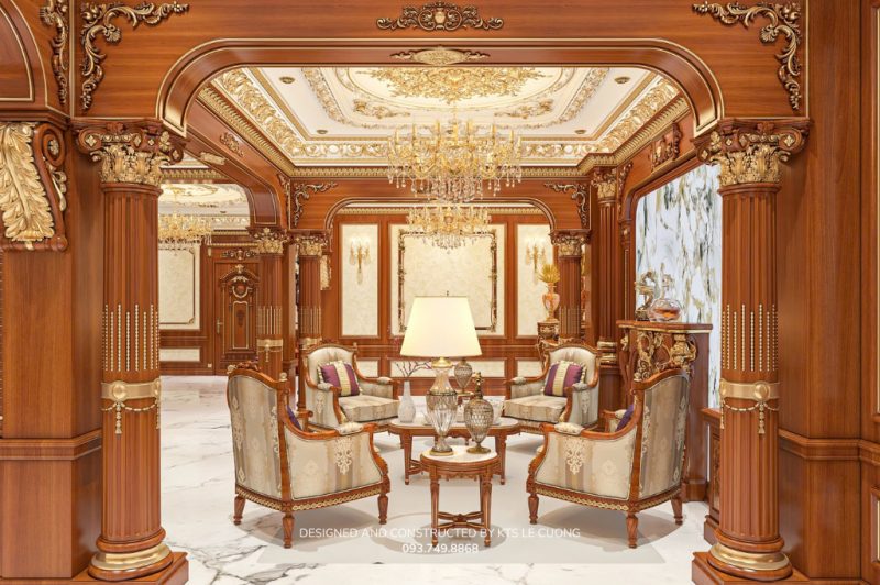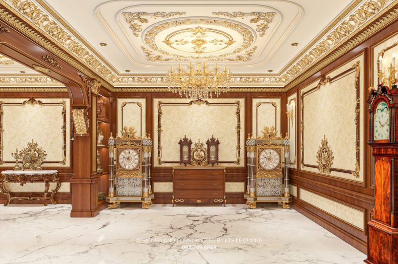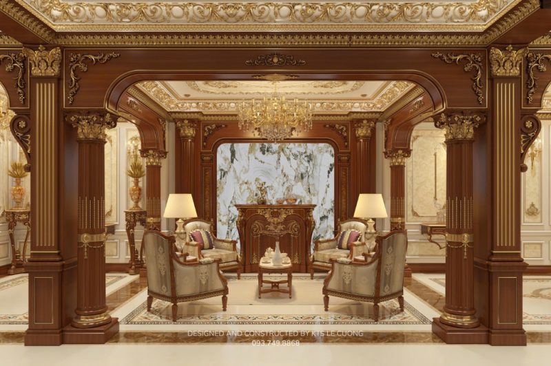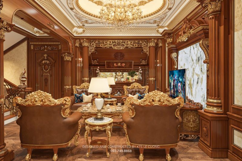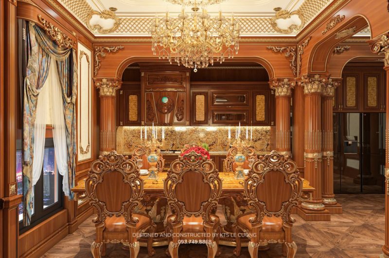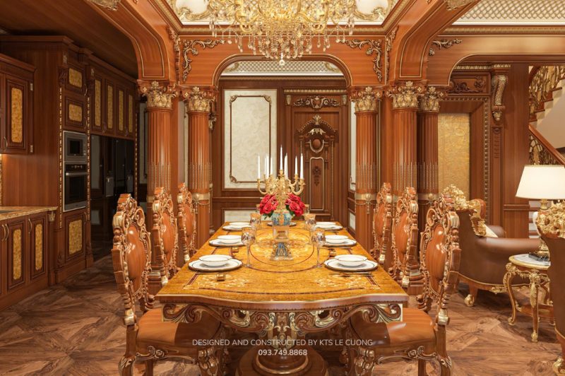 Bước qua ngưỡng cửa, bạn như lạc vào dạ tiệc ánh vàng, nơi những cột trụ dát dát hoa văn đồng điệu cùng trần vòm khắc họa tinh xảo tỏa sáng như khung trời hoàng kim. Từng đường cong mềm mại trên tựa ghế được chế tác thủ công như lời thì thầm của nghệ nhân, mời gọi bạn chạm vào sự hoàn mỹ. Bàn ăn long lanh giữa trung tâm phòng khách kiêu hãnh tựa vương triều xưa, mời gọi những bữa tiệc thân mật đầy ắp tiếng cười và ấm áp.