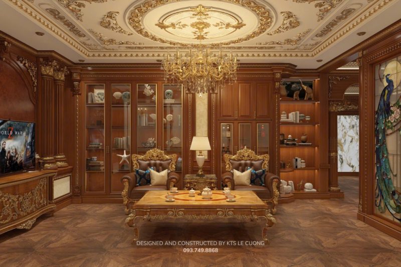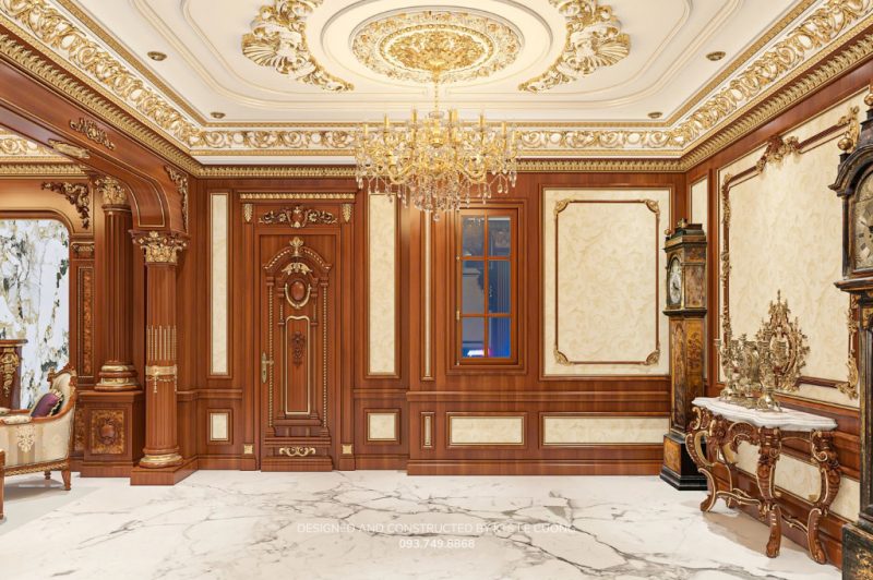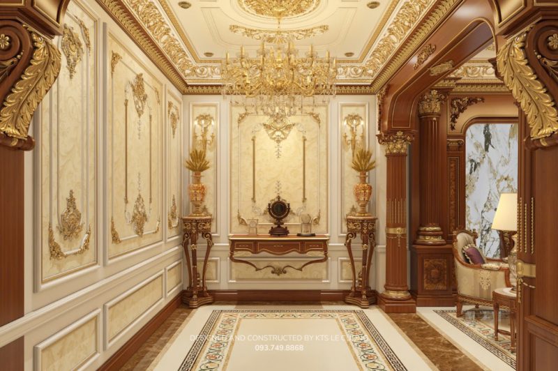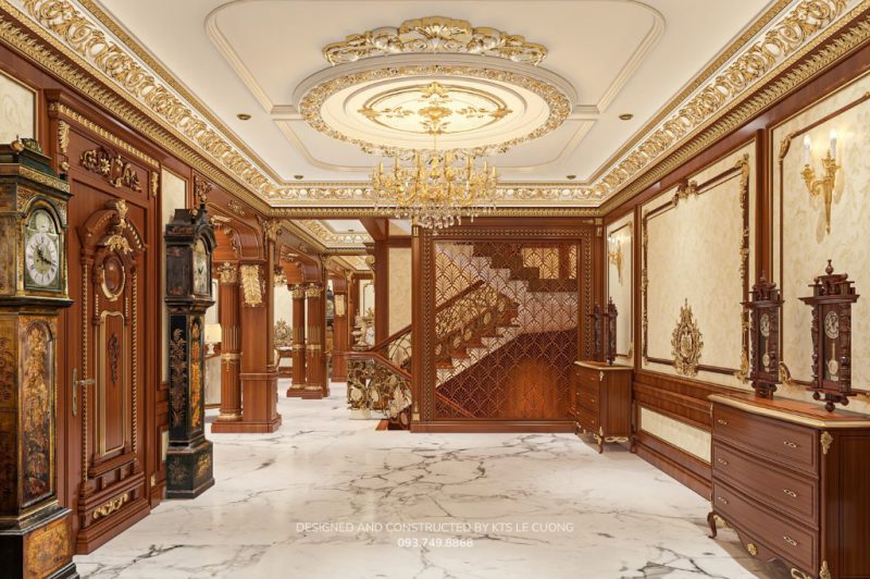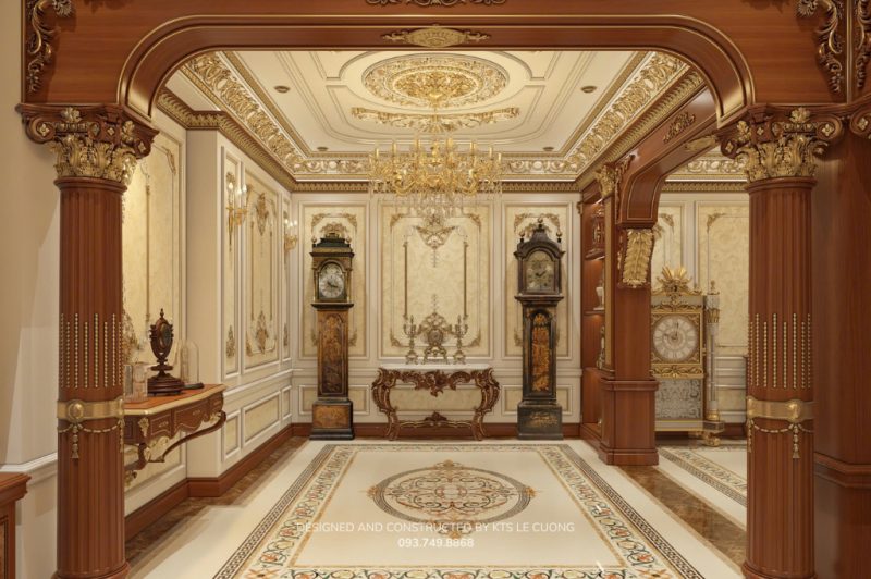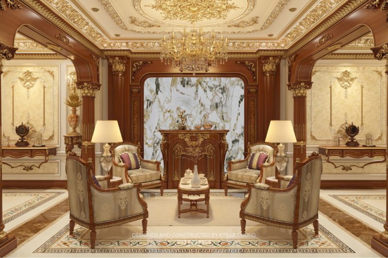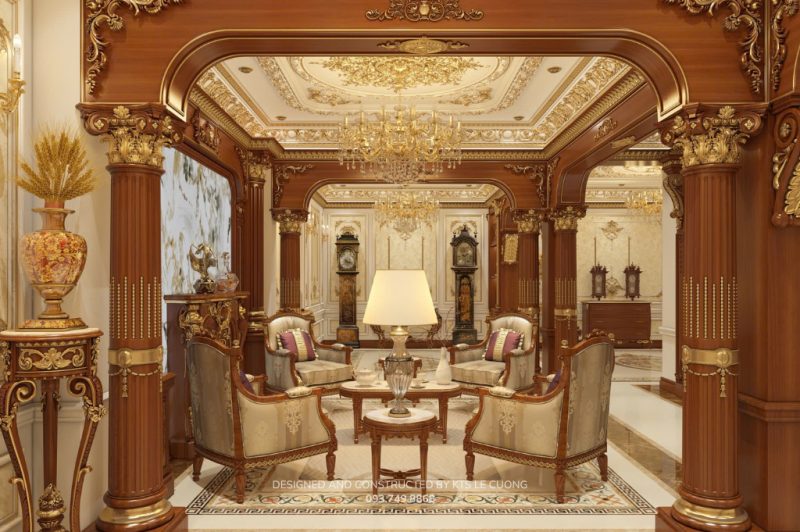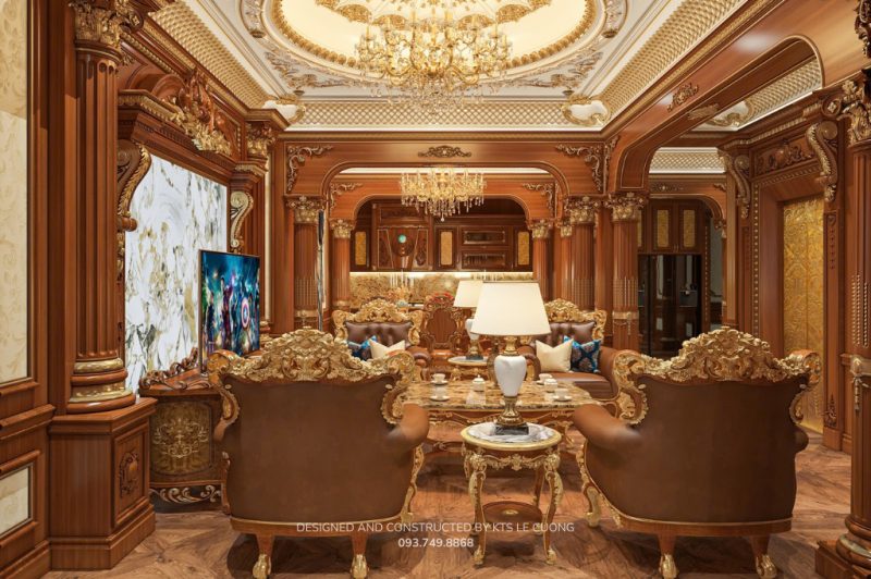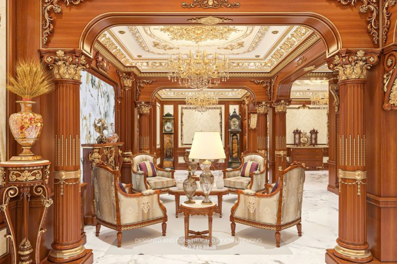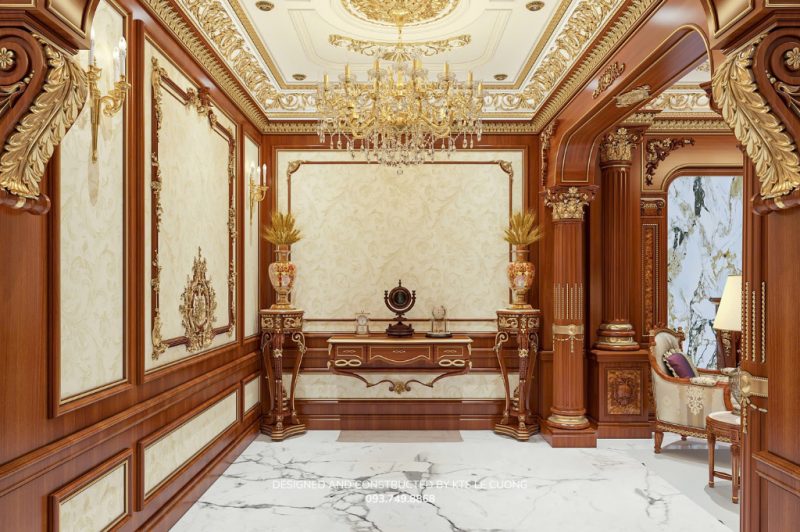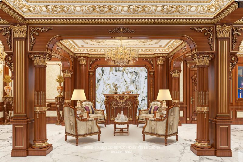 Bước qua ngưỡng cửa, bạn như lạc vào dạ tiệc ánh vàng, nơi những cột trụ dát dát hoa văn đồng điệu cùng trần vòm khắc họa tinh xảo tỏa sáng như khung trời hoàng kim. Từng đường cong mềm mại trên tựa ghế được chế tác thủ công như lời thì thầm của nghệ nhân, mời gọi bạn chạm vào sự hoàn mỹ. Bàn ăn long lanh giữa trung tâm phòng khách kiêu hãnh tựa vương triều xưa, mời gọi những bữa tiệc thân mật đầy ắp tiếng cười và ấm áp.