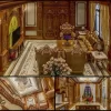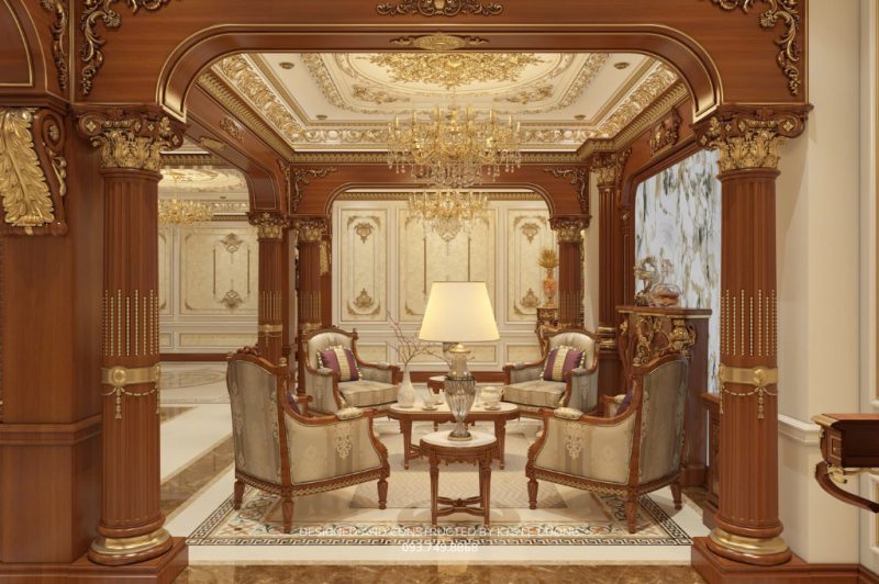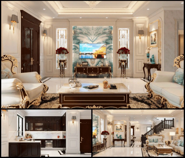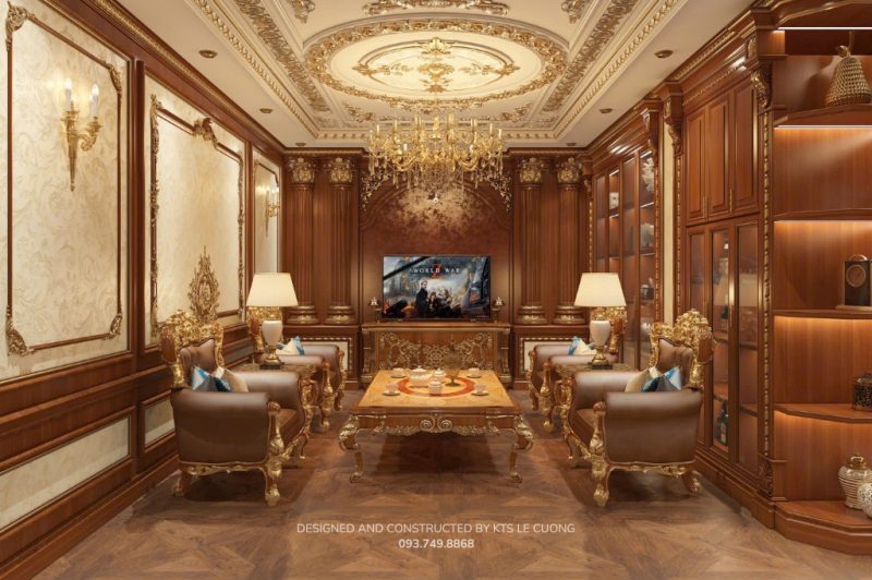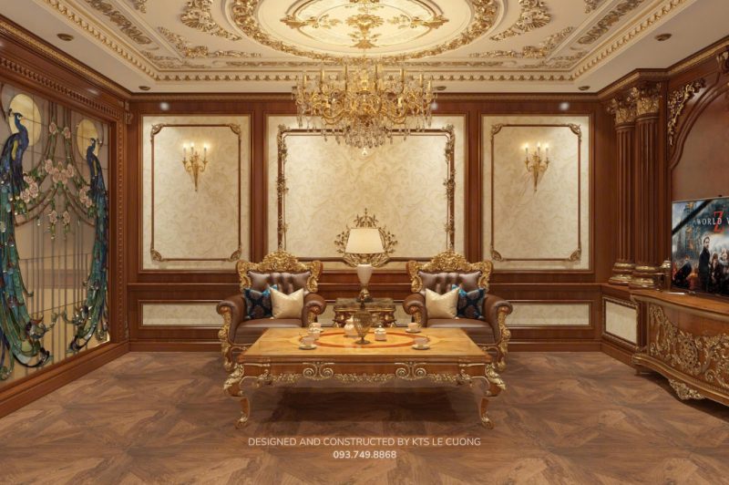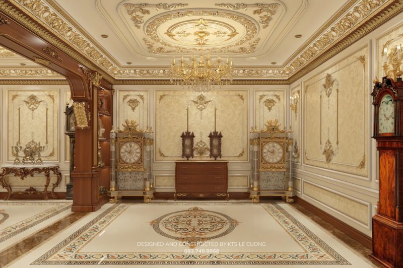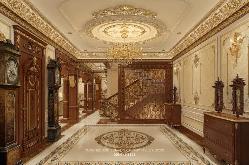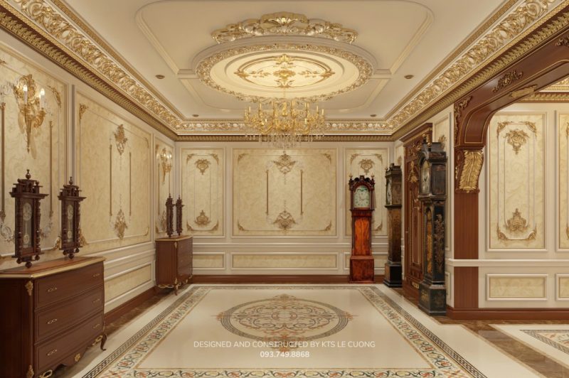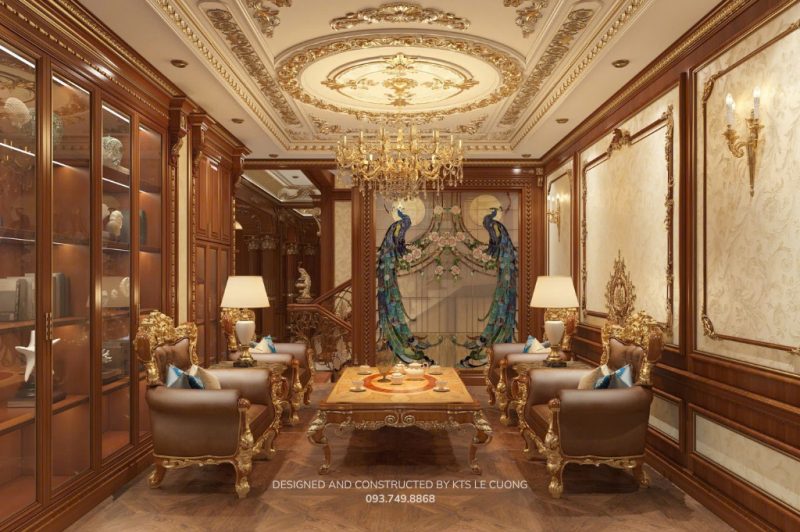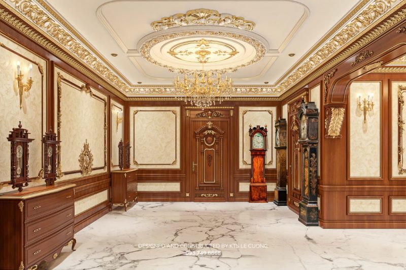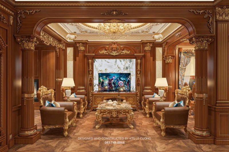 Bước qua ngưỡng cửa, bạn như lạc vào dạ tiệc ánh vàng, nơi những cột trụ dát dát hoa văn đồng điệu cùng trần vòm khắc họa tinh xảo tỏa sáng như khung trời hoàng kim. Từng đường cong mềm mại trên tựa ghế được chế tác thủ công như lời thì thầm của nghệ nhân, mời gọi bạn chạm vào sự hoàn mỹ. Bàn ăn long lanh giữa trung tâm phòng khách kiêu hãnh tựa vương triều xưa, mời gọi những bữa tiệc thân mật đầy ắp tiếng cười và ấm áp.