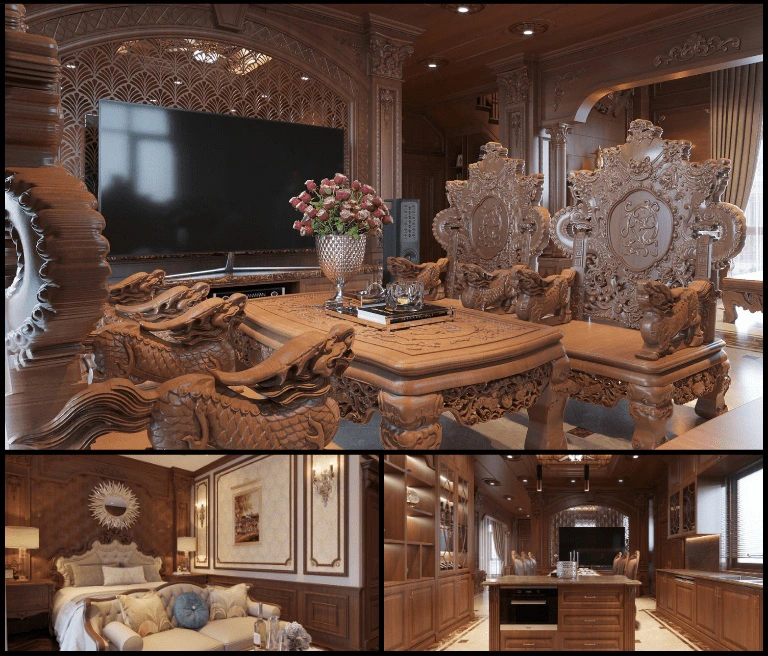 – Định hình phong cách: Cổ điển tinh hoa – nơi gỗ Gõ đỏ Pachy thượng hạng giao thoa cùng ánh sáng đèn chùm pha lê, kể câu chuyện về đẳng cấp và gu thẩm mỹ vượt thời gian.