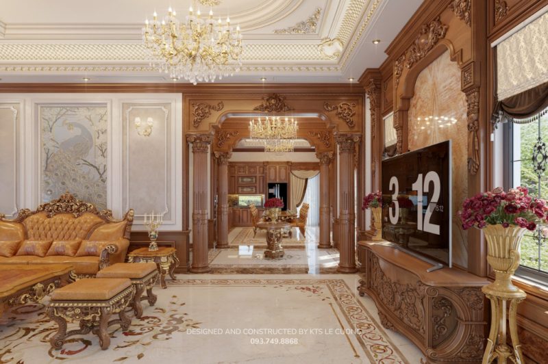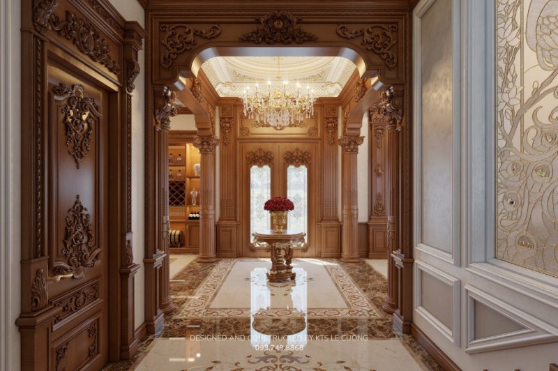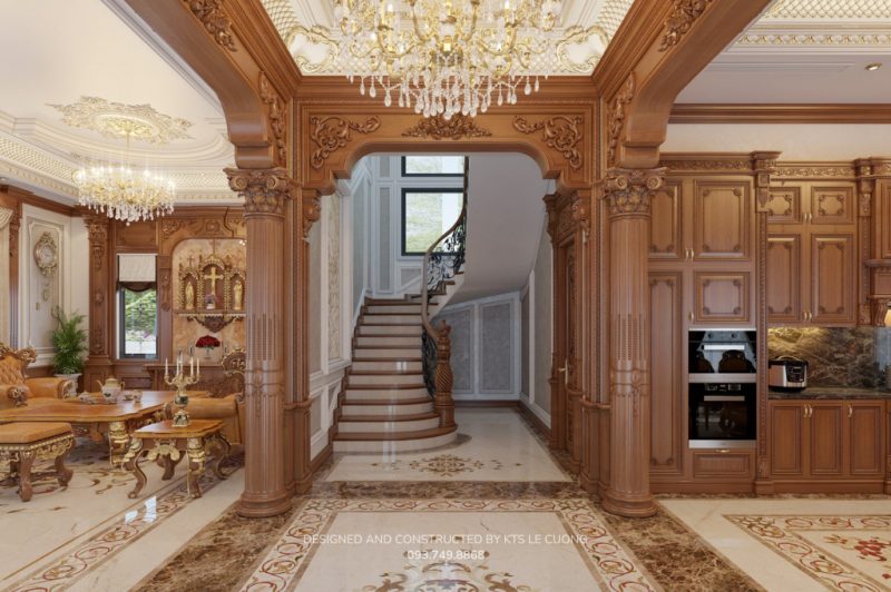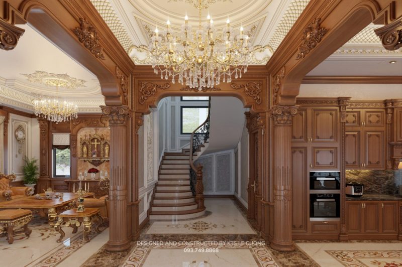 Trên khu đất rộng 672 m² với mặt tiền 12 m và chiều sâu 14 m, biệt thự Kiên – Nga tại Sơn Thanh Hóa tựa như khúc giao hưởng tân cổ điển được dàn dựng công phu từng chi tiết. Lớp áo sơn trắng ngà mượt mà kết hợp cùng phào chỉ mềm mại trên nền gỗ tự nhiên cao cấp, tạo nên nhịp điệu uyển chuyển như những nốt nhạc Baroque vang vọng qua thời gian. Hệ cửa sổ vòm cao thoáng đón trọn ánh sáng, đồng thời mở ra tầm nhìn xanh mát của vườn tiểu cảnh, khiến ngôi nhà luôn hiện hữu trong trạng thái giao hòa cùng thiên nhiên.