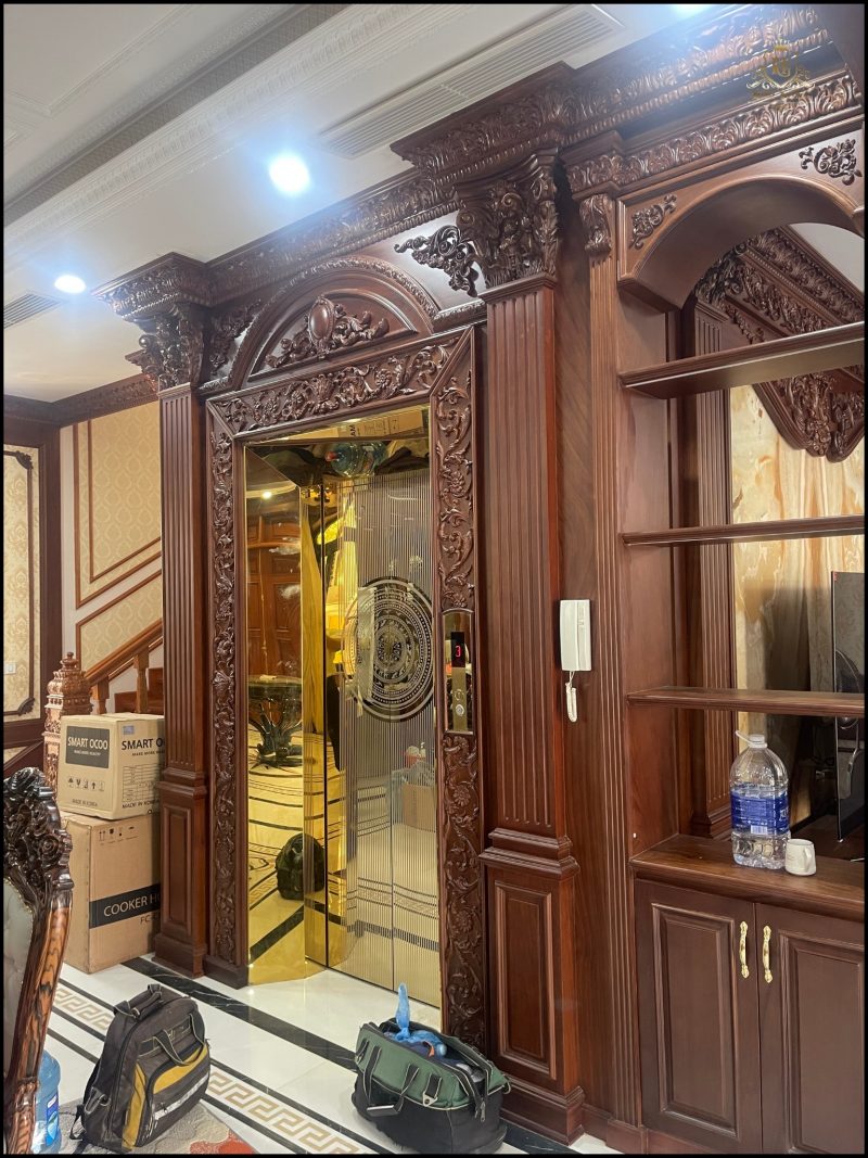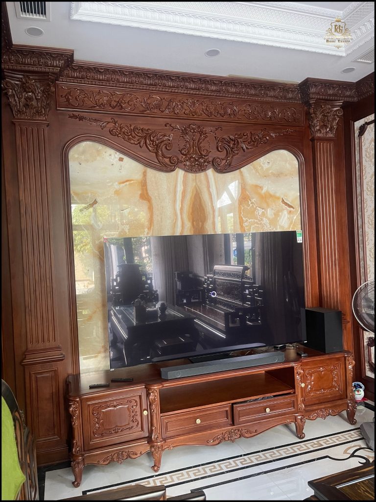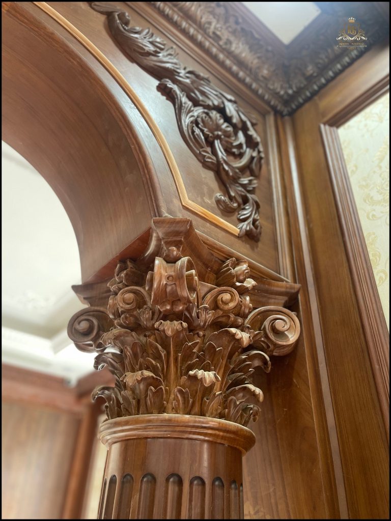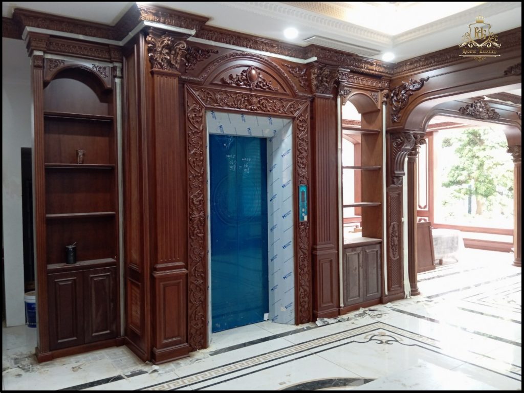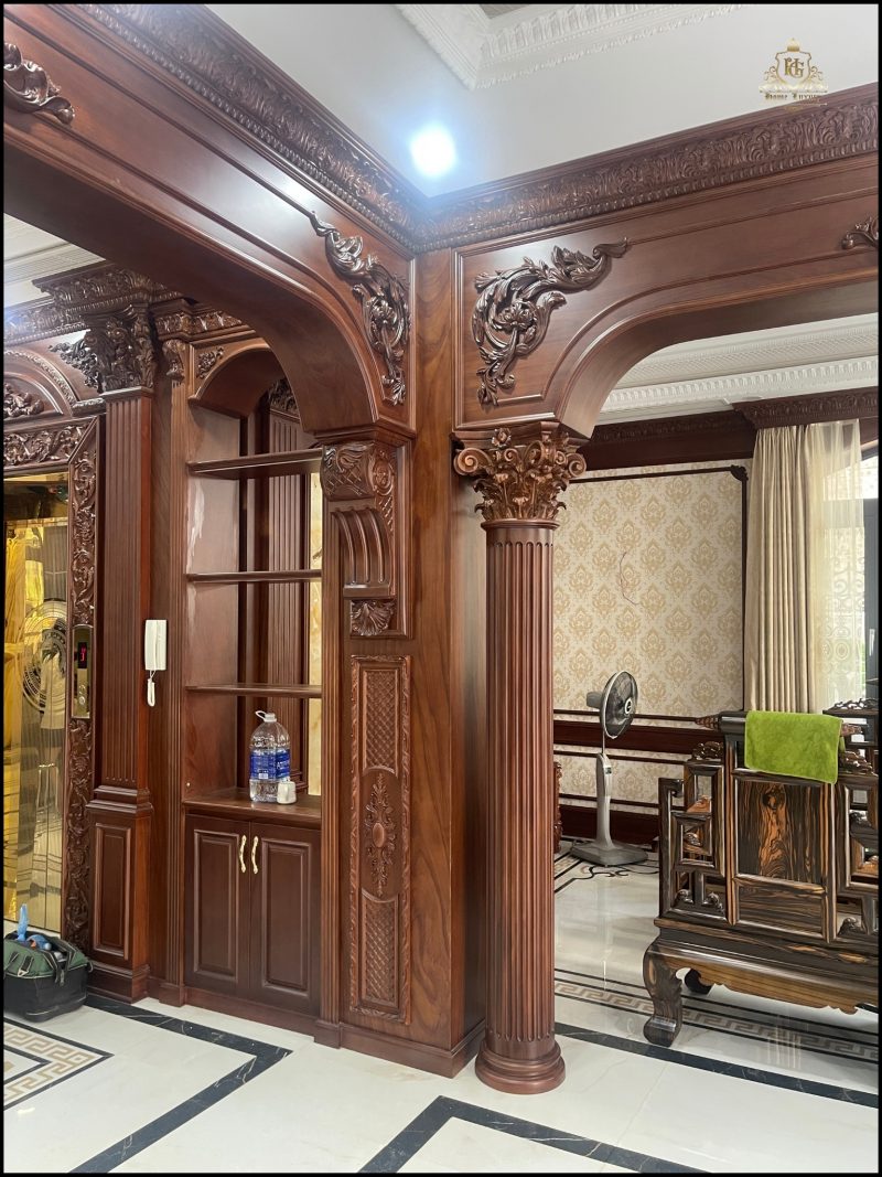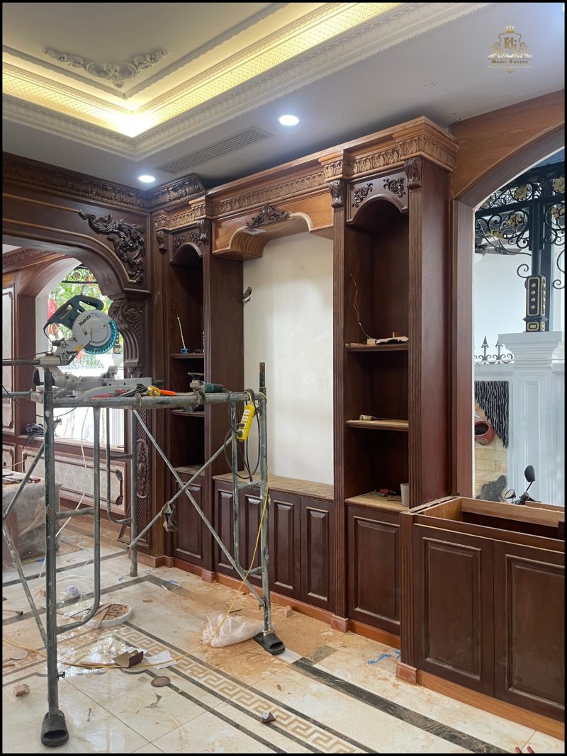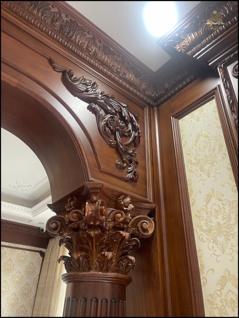 Công trình mang phong cách tân cổ điển sang trọng, nổi bật với hệ cột trụ và chi tiết phào chỉ chạm trổ tinh xảo. Gỗ tự nhiên được tuyển chọn kỹ lưỡng, xử lý bề mặt bóng mịn, tôn lên vẻ đẹp quyền quý và ấm áp cho không gian nội thất.