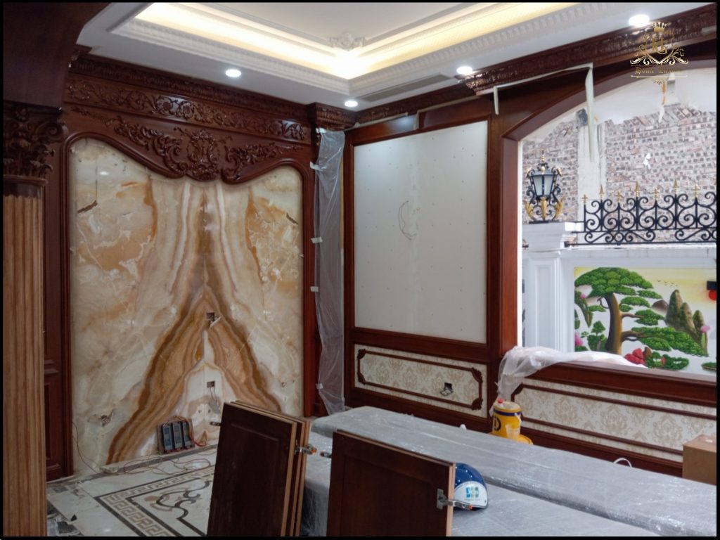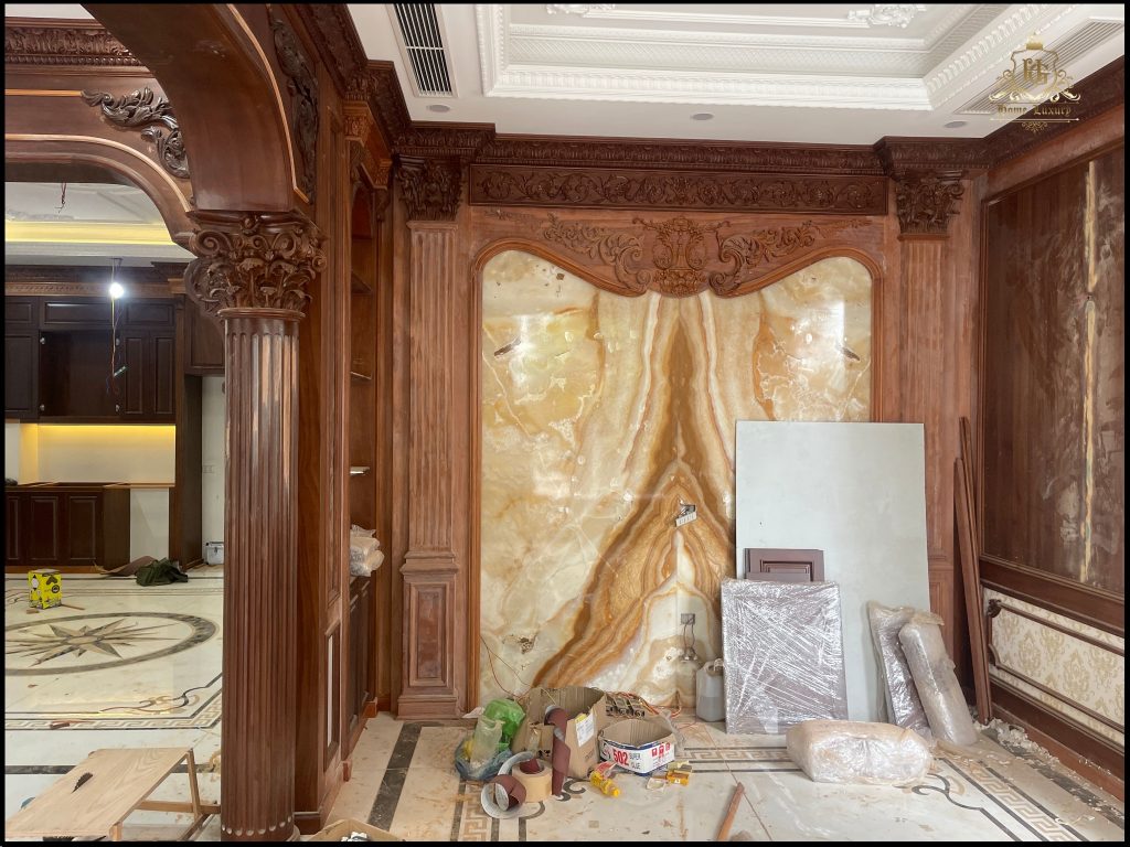 Các mảng tường được trang trí bằng đá onyx cao cấp, phối hợp hài hòa với hệ tủ âm tường và chi tiết trang trí cổ điển. Trần nhà được đắp phào chỉ và hoa văn tinh tế, kết hợp ánh sáng âm trần tạo nên sự mềm mại, bề thế.