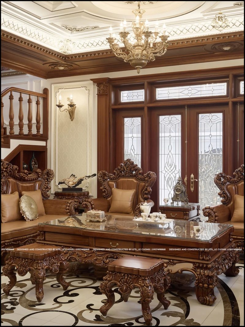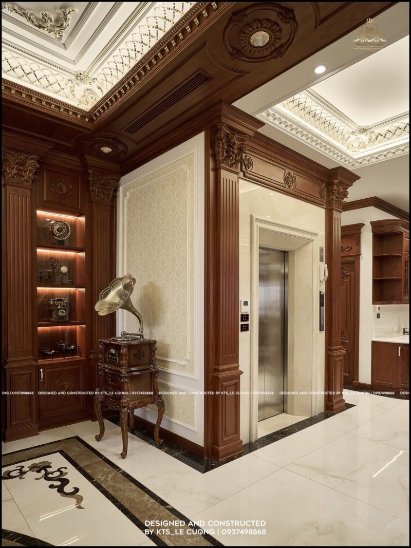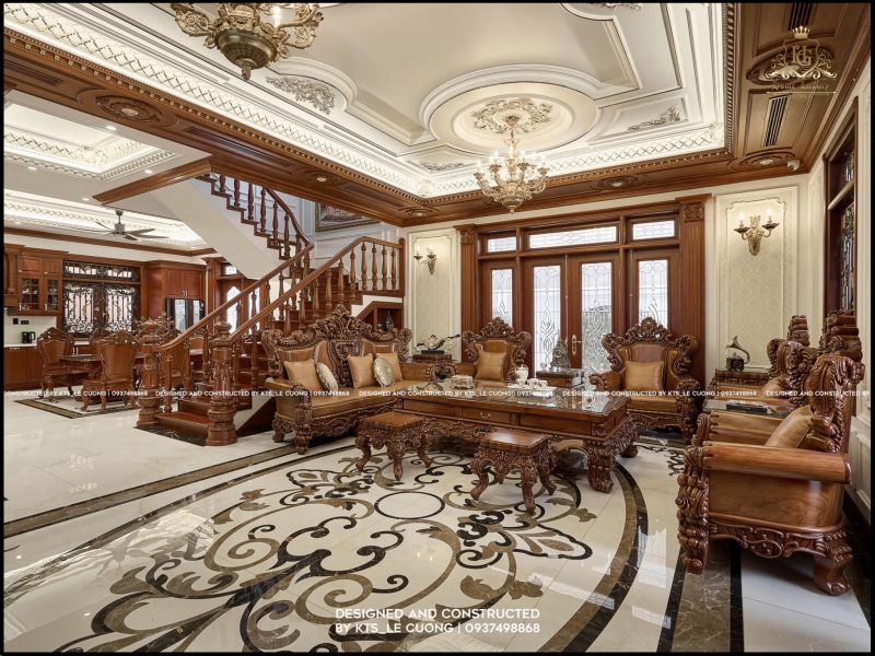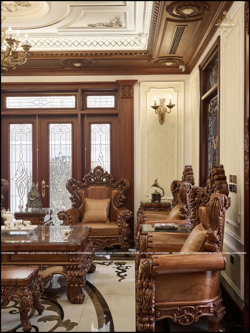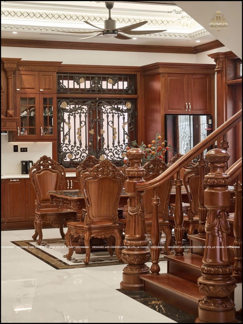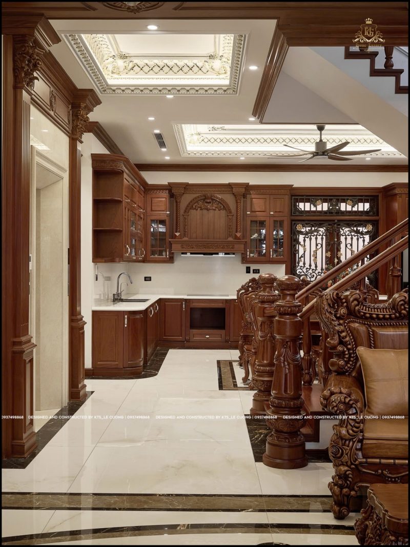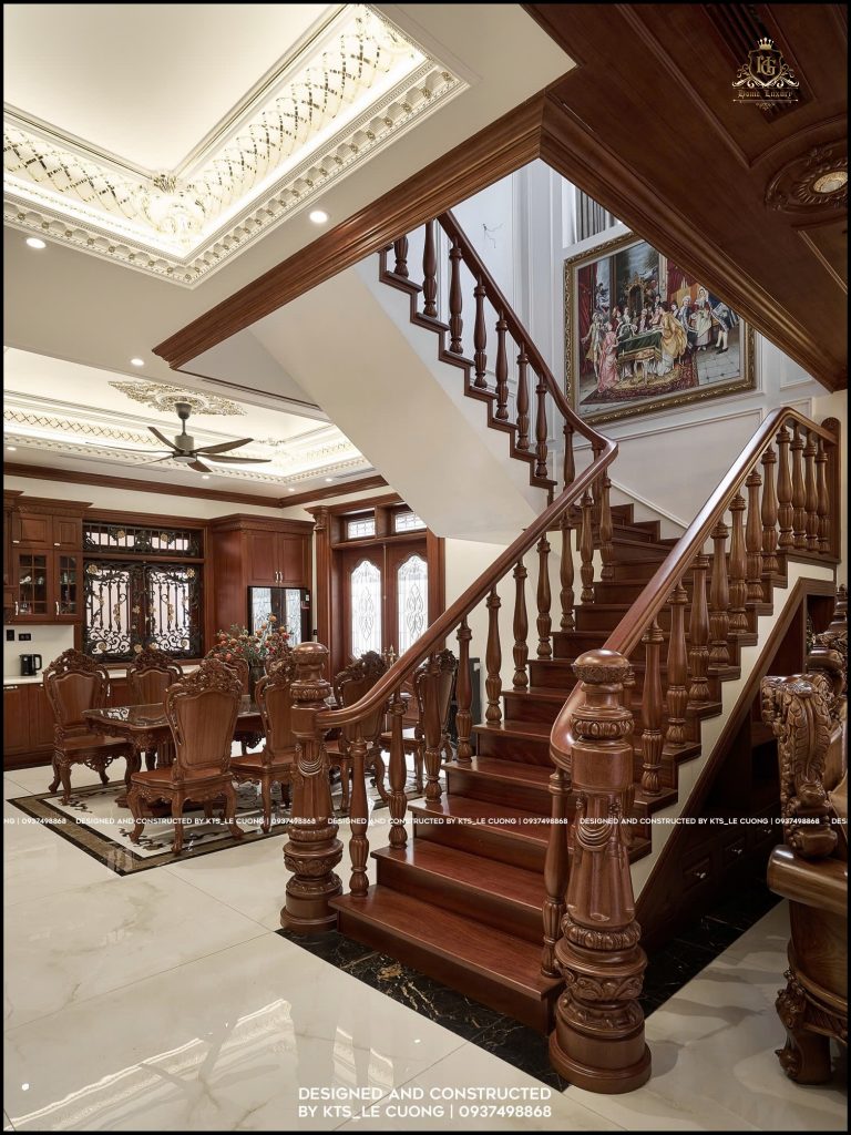 Bên trong, nội thất sử dụng gỗ tự nhiên cao cấp, chạm khắc tinh xảo từ cửa, cầu thang đến các chi tiết ốp tường. Trần nhà trang trí phào chỉ và đèn chùm mạ vàng sang trọng. Phòng khách, phòng ngủ, sảnh thang đều toát lên vẻ xa hoa, quyền quý.