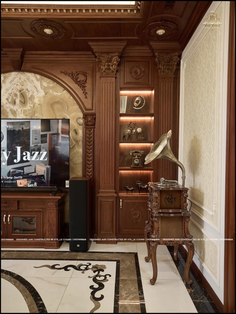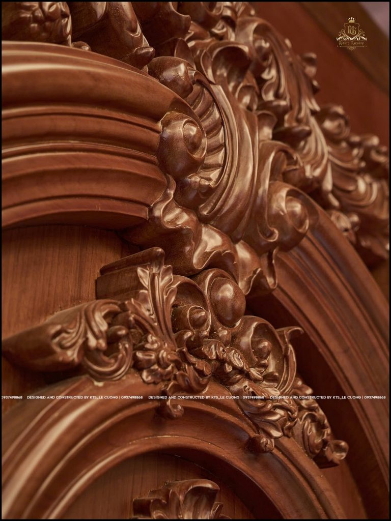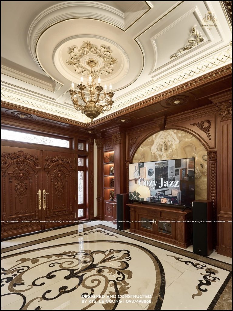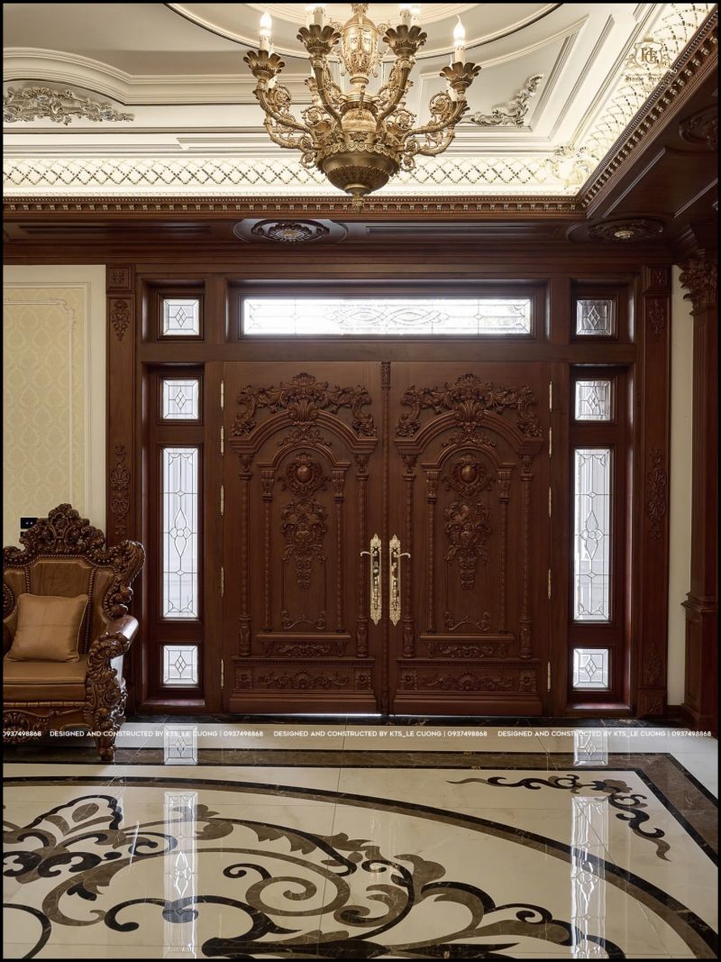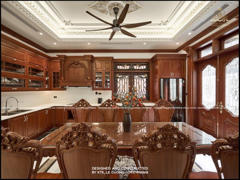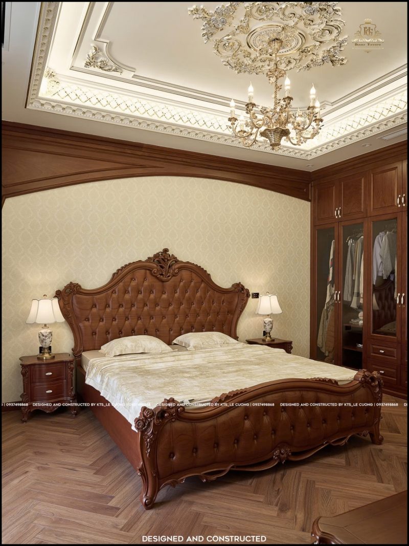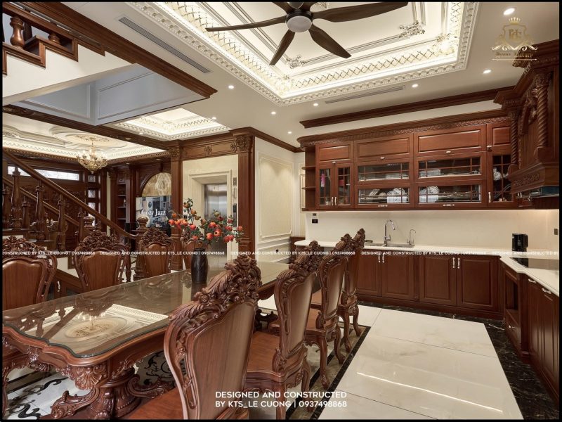 Bên trong, nội thất sử dụng gỗ tự nhiên cao cấp, chạm khắc tinh xảo từ cửa, cầu thang đến các chi tiết ốp tường. Trần nhà trang trí phào chỉ và đèn chùm mạ vàng sang trọng. Phòng khách, phòng ngủ, sảnh thang đều toát lên vẻ xa hoa, quyền quý.