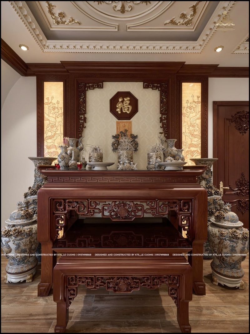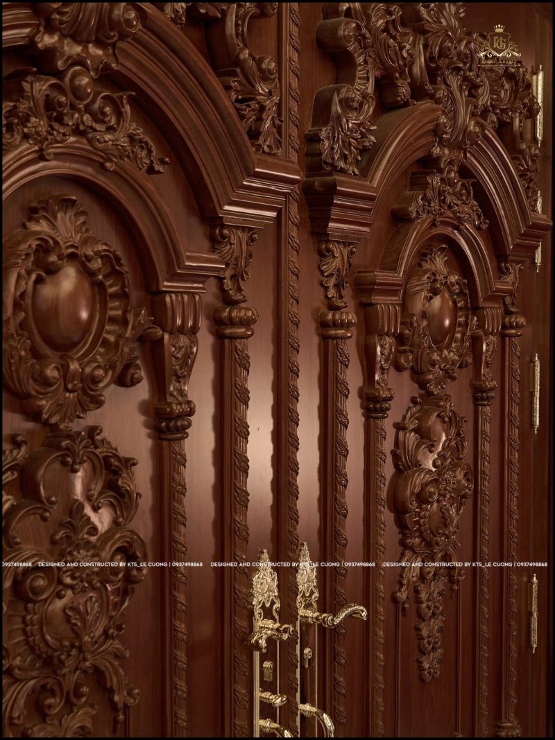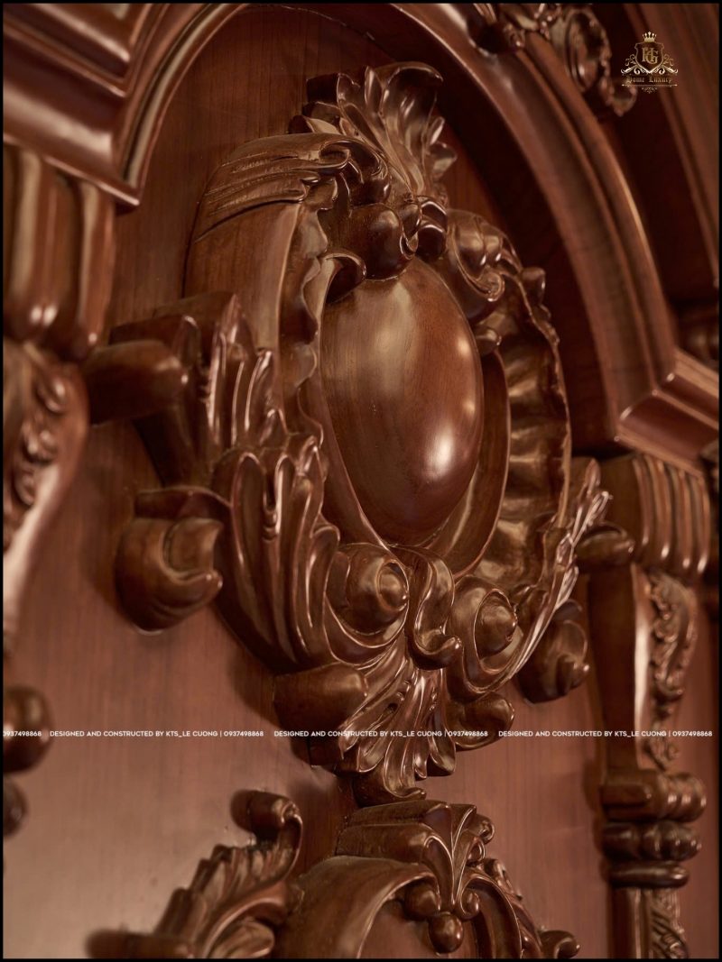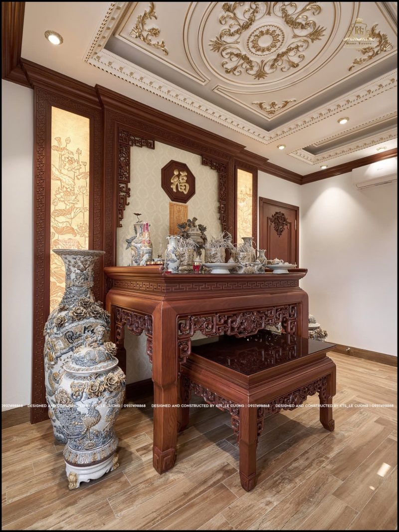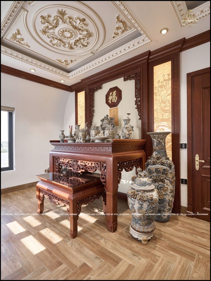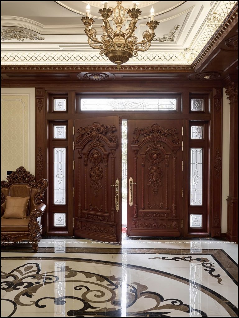 Bên trong, nội thất sử dụng gỗ tự nhiên cao cấp, chạm khắc tinh xảo từ cửa, cầu thang đến các chi tiết ốp tường. Trần nhà trang trí phào chỉ và đèn chùm mạ vàng sang trọng. Phòng khách, phòng ngủ, sảnh thang đều toát lên vẻ xa hoa, quyền quý.