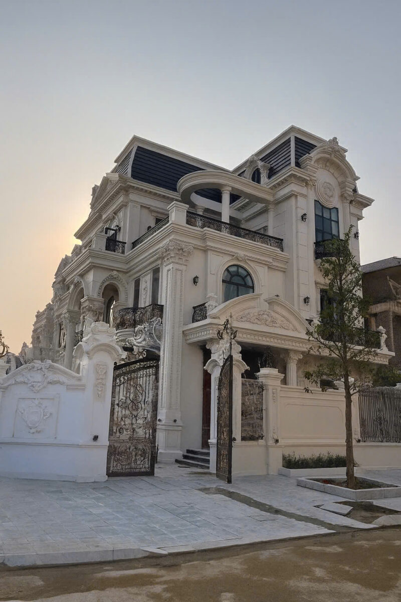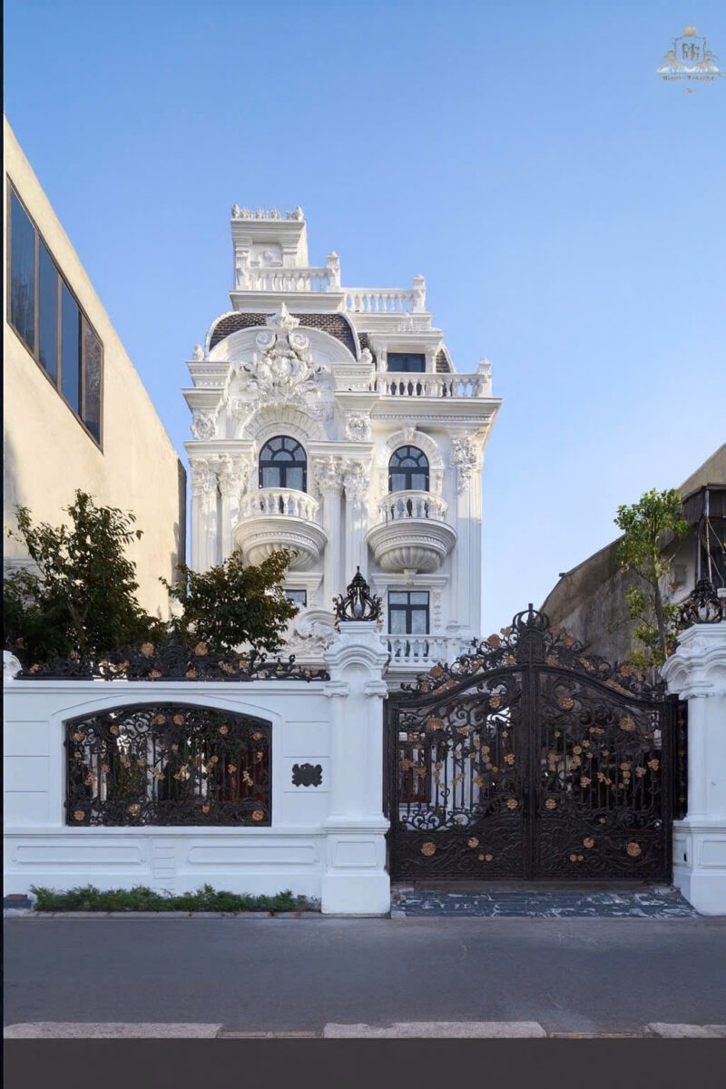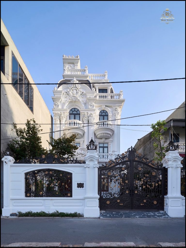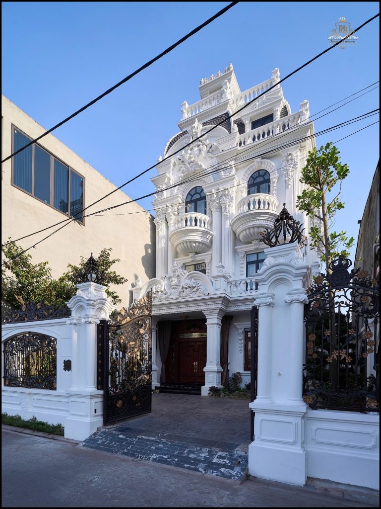 Biệt thự tân cổ điển đẳng cấp, nổi bật với mặt tiền trắng tinh tế, các chi tiết hoa văn đắp nổi cầu kỳ và hệ cột La Mã bề thế.