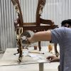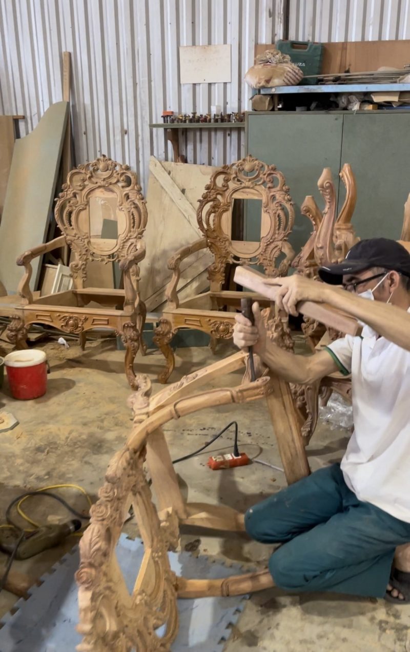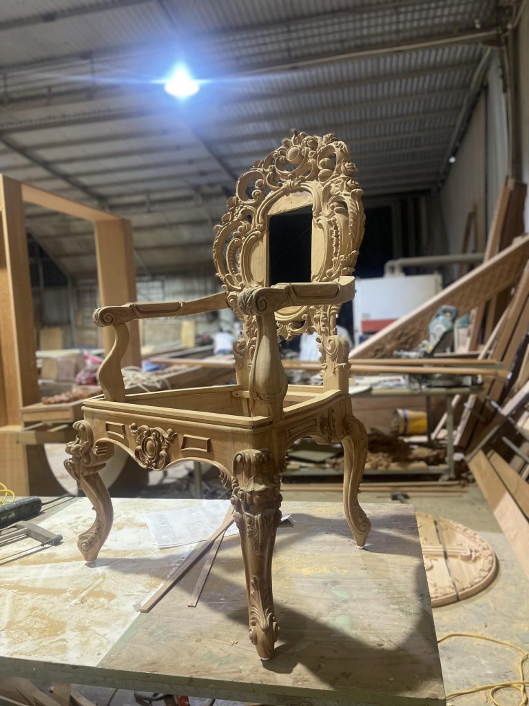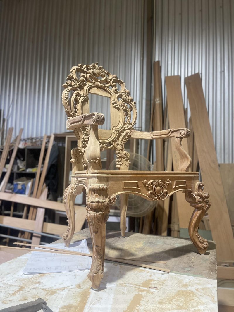 Khung ghế gỗ tự nhiên được sơn bóng và dát vàng nổi bật, kết hợp đệm bọc da cao cấp, mang lại trải nghiệm thoải mái và thẩm mỹ vượt trội cho không gian sống thượng lưu.