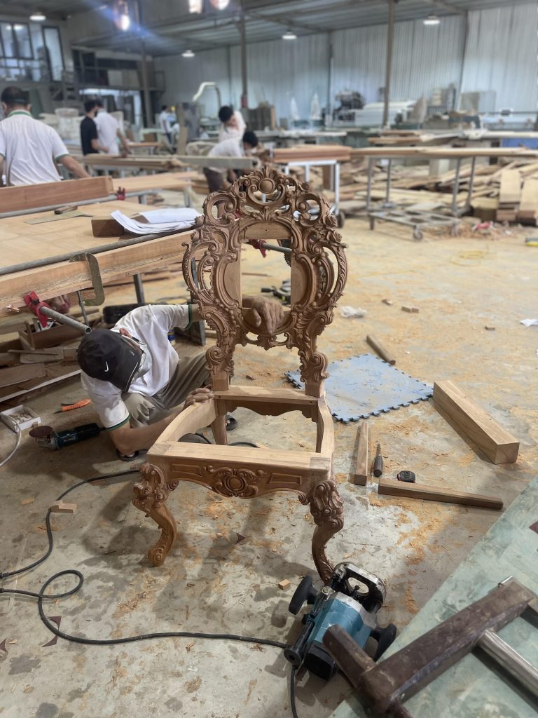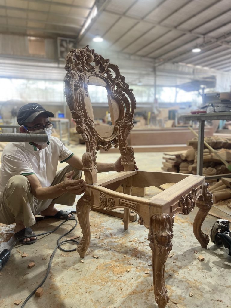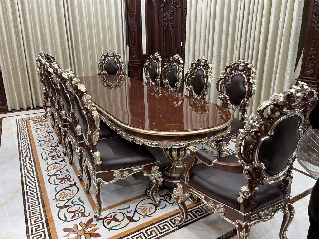 Bộ bàn ăn tân cổ điển đẳng cấp với từng chi tiết chạm khắc thủ công tinh xảo, tôn vinh vẻ đẹp hoàng gia sang trọng.