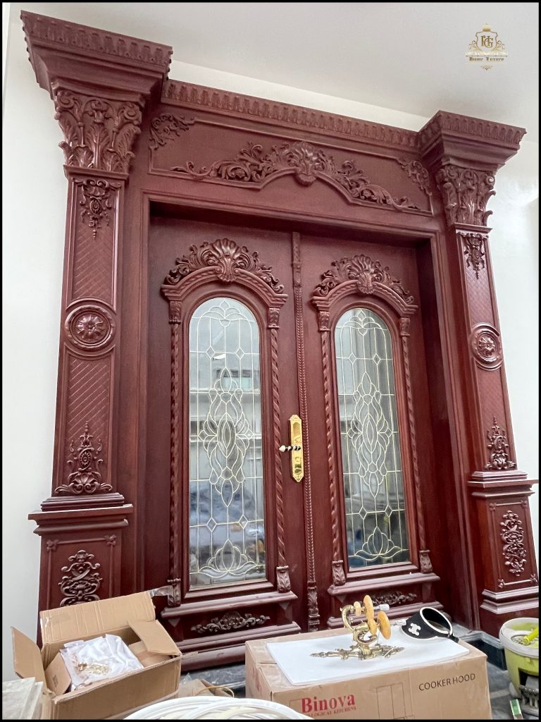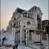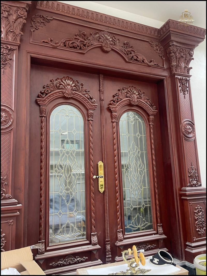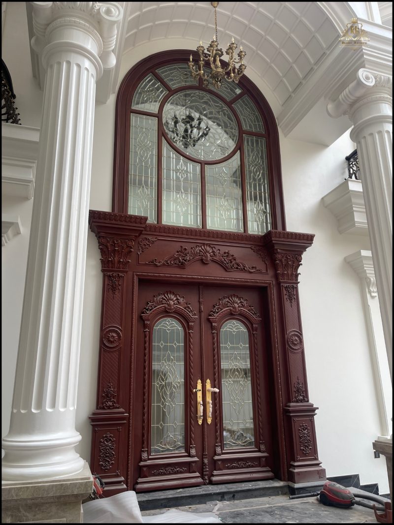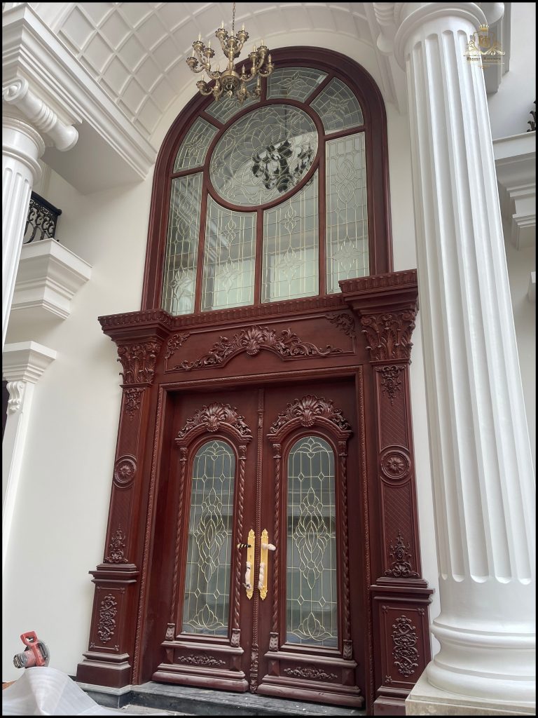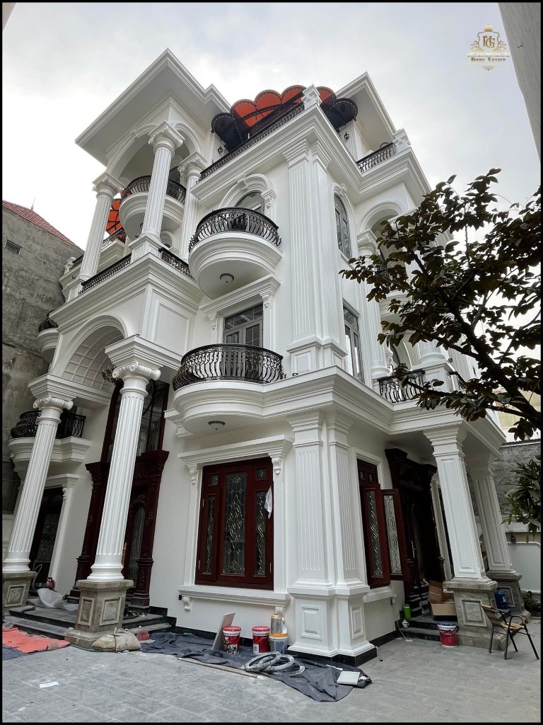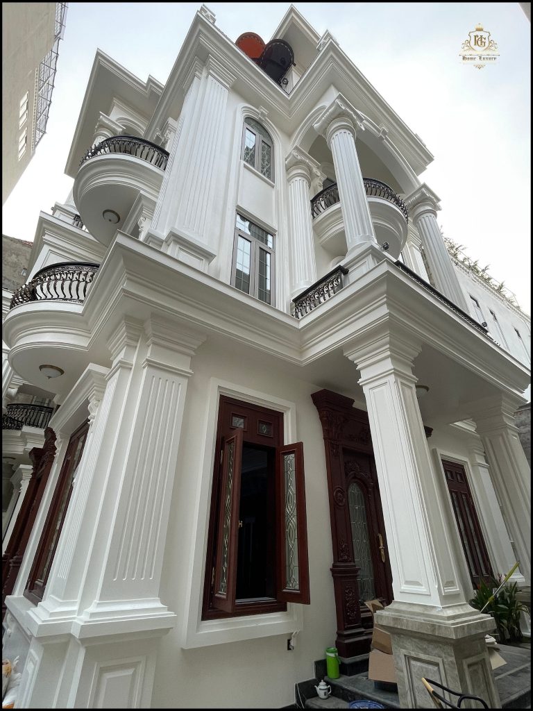 Biệt thự tân cổ điển sang trọng, nổi bật với mặt tiền trắng tinh khôi cùng hệ cột trụ La Mã bề thế. Cửa chính và hệ khung bao ốp gỗ đỏ tự nhiên, chạm khắc tinh xảo, kết hợp kính hoa đồng nghệ thuật, tôn lên vẻ đẳng cấp và quyền quý.