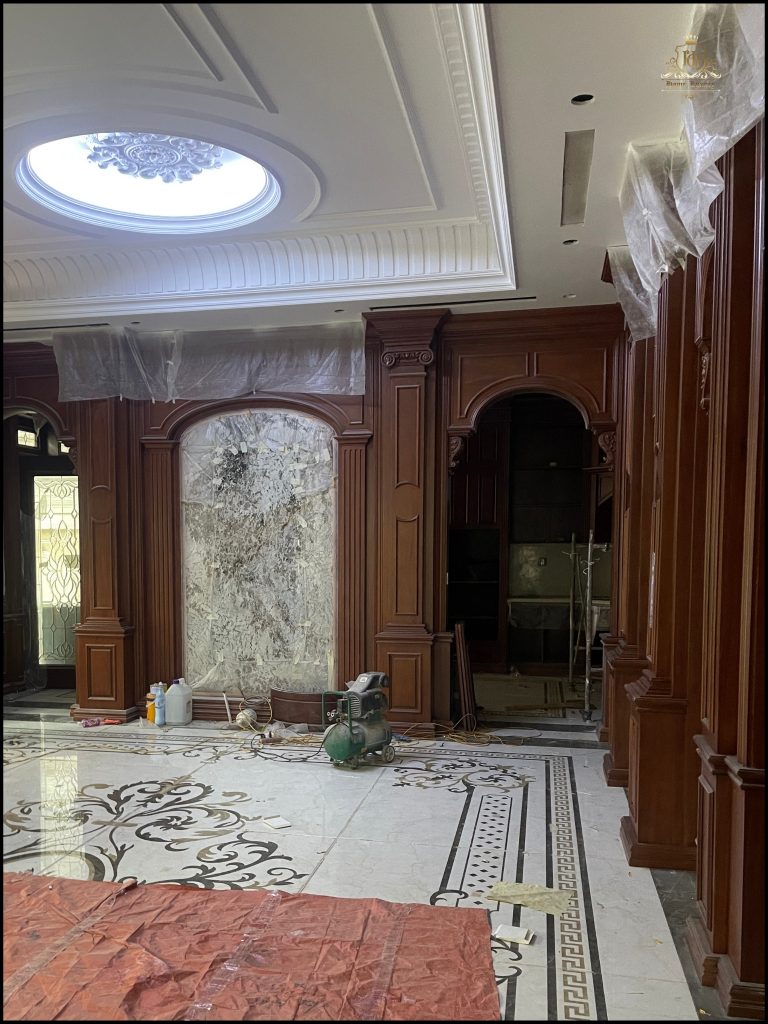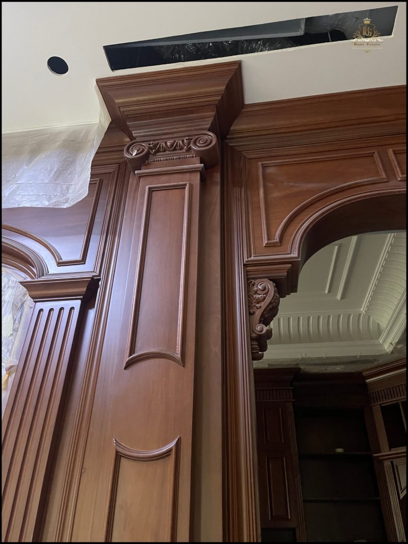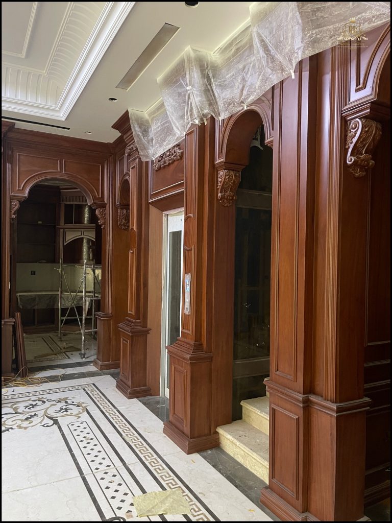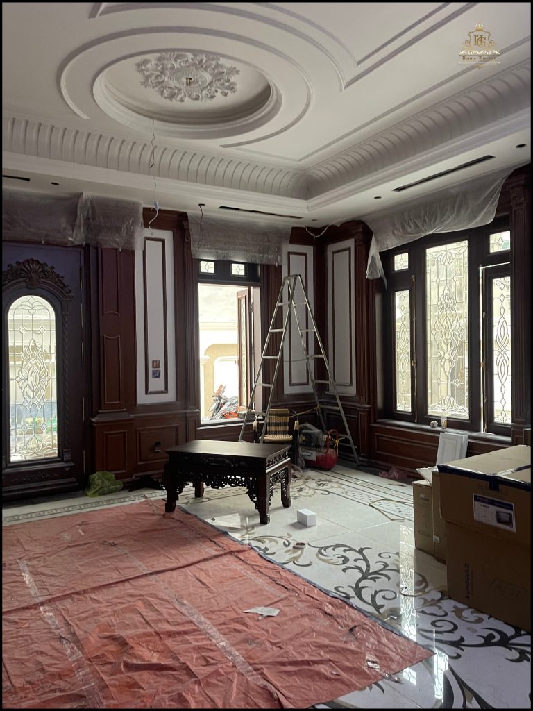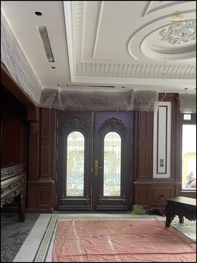 Nội thất bên trong hoàn thiện với hệ Lamri ốp gỗ, phào chỉ nổi bật trên nền sàn đá hoa cương họa tiết cổ điển. Trần nhà đắp vòm mềm mại, phối đèn chùm đồng tạo ánh sáng ấm áp, hoàn thiện không gian sống tinh tế, đậm chất hoàng gia.