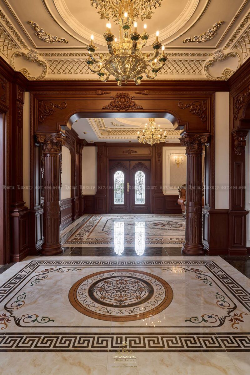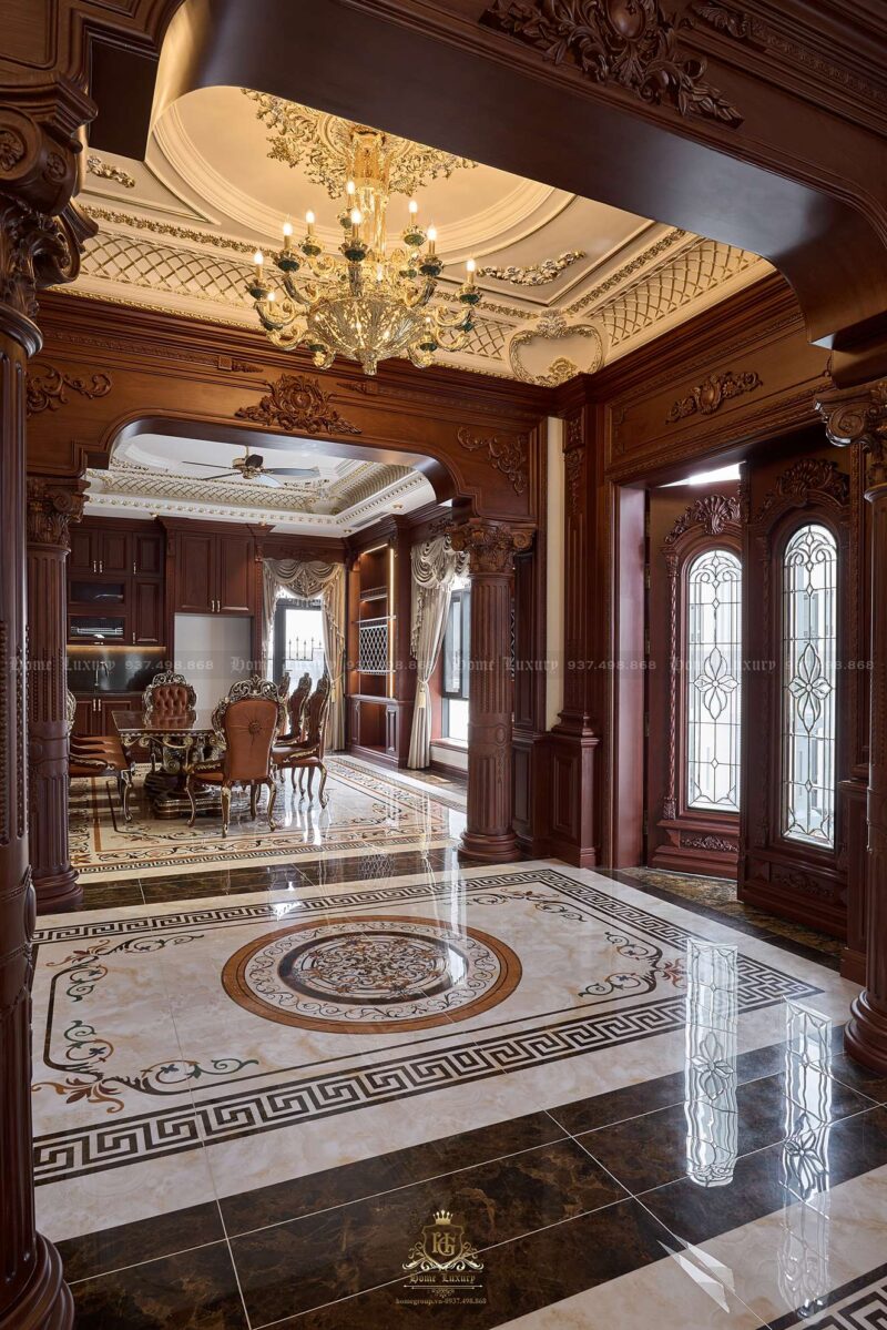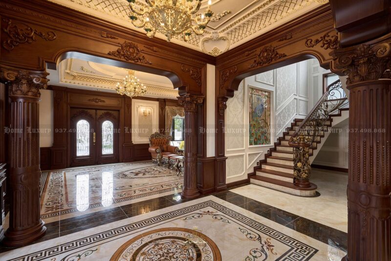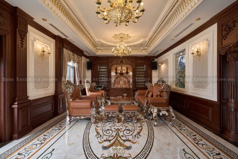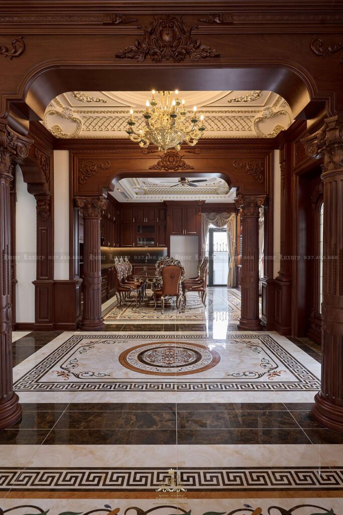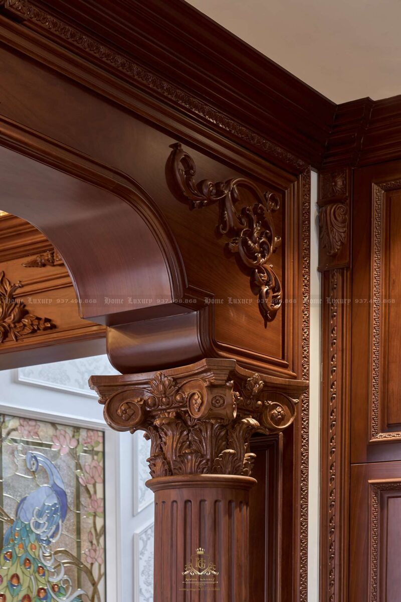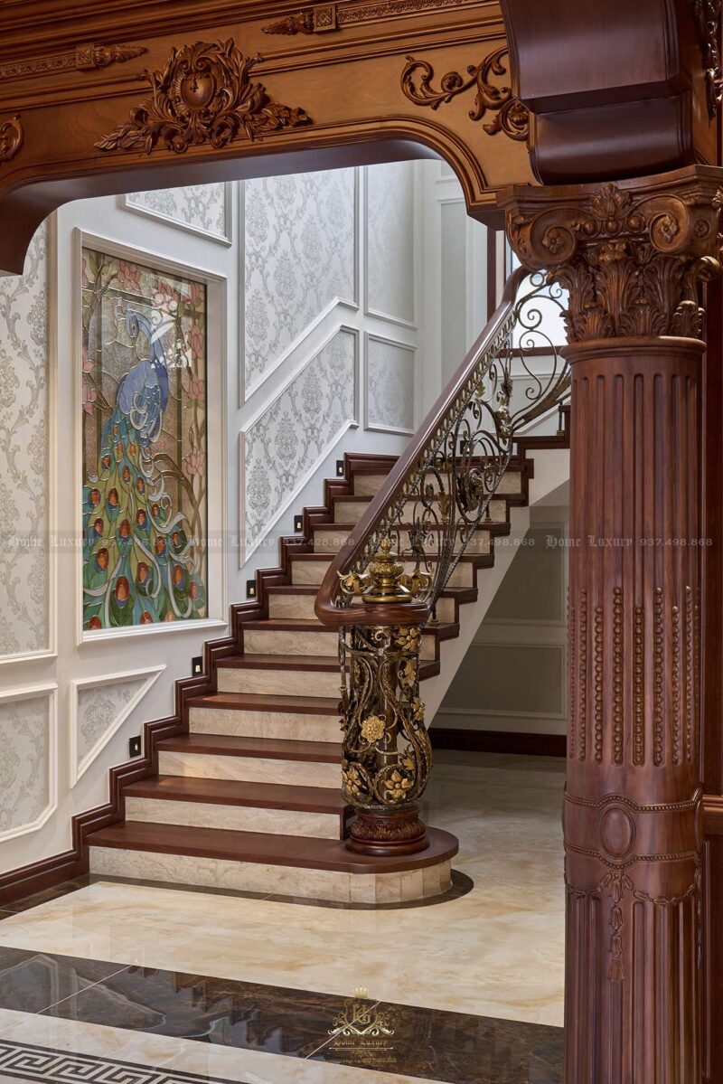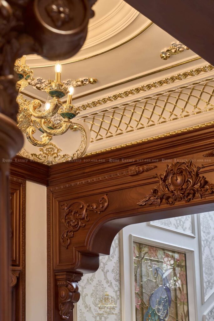 Bên trong, nội thất sử dụng gỗ tự nhiên cao cấp, chạm khắc tinh xảo từ cửa, cầu thang đến các chi tiết ốp tường. Trần nhà trang trí phào chỉ và đèn chùm mạ vàng sang trọng. Phòng khách, phòng ngủ, sảnh thang đều toát lên vẻ xa hoa, quyền quý.