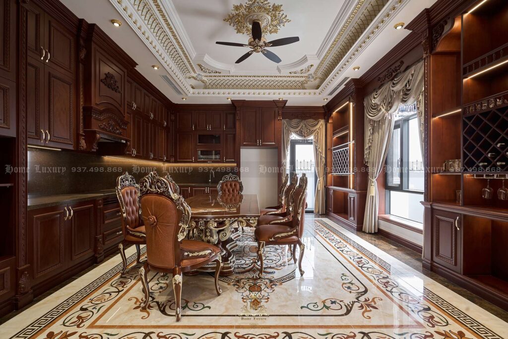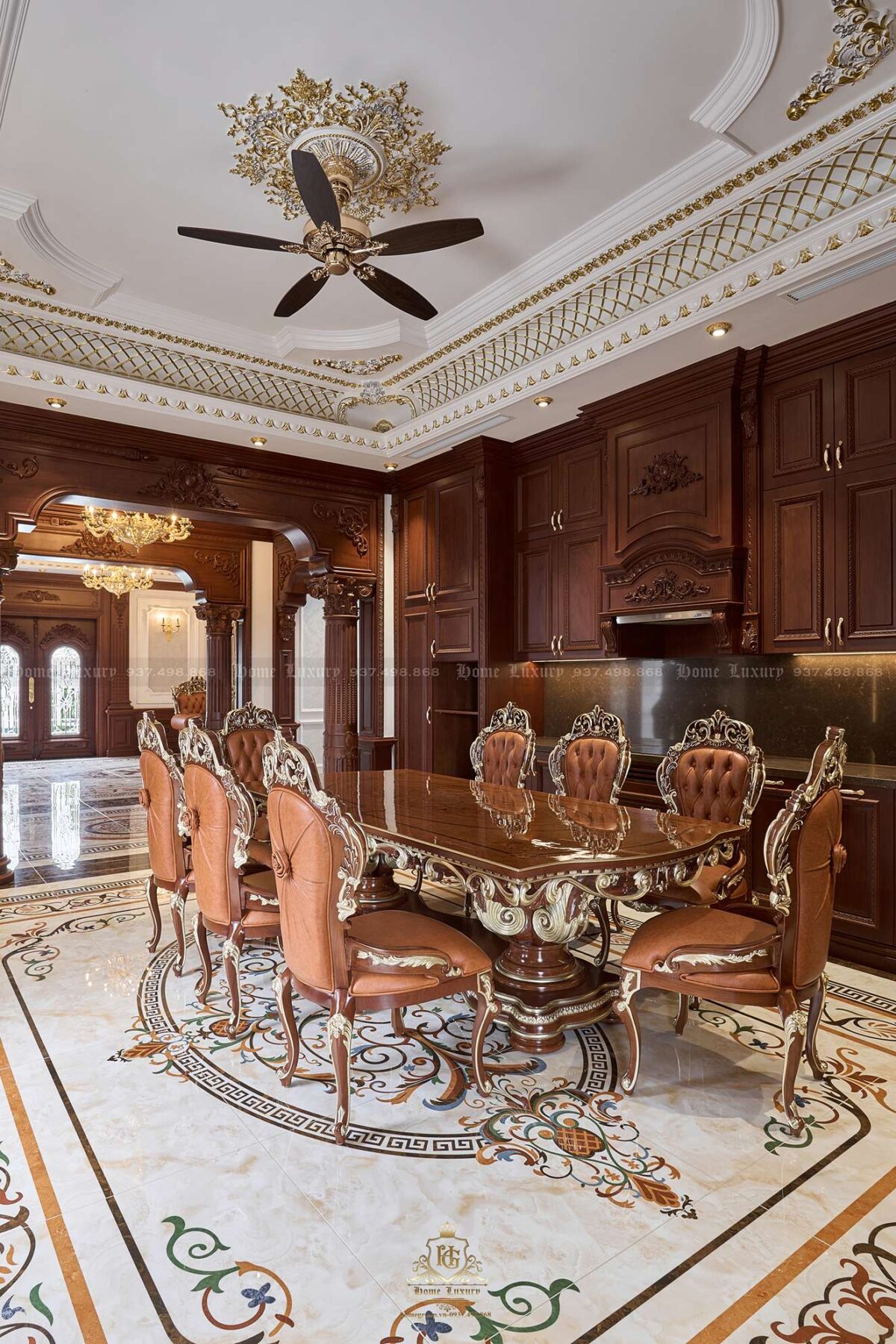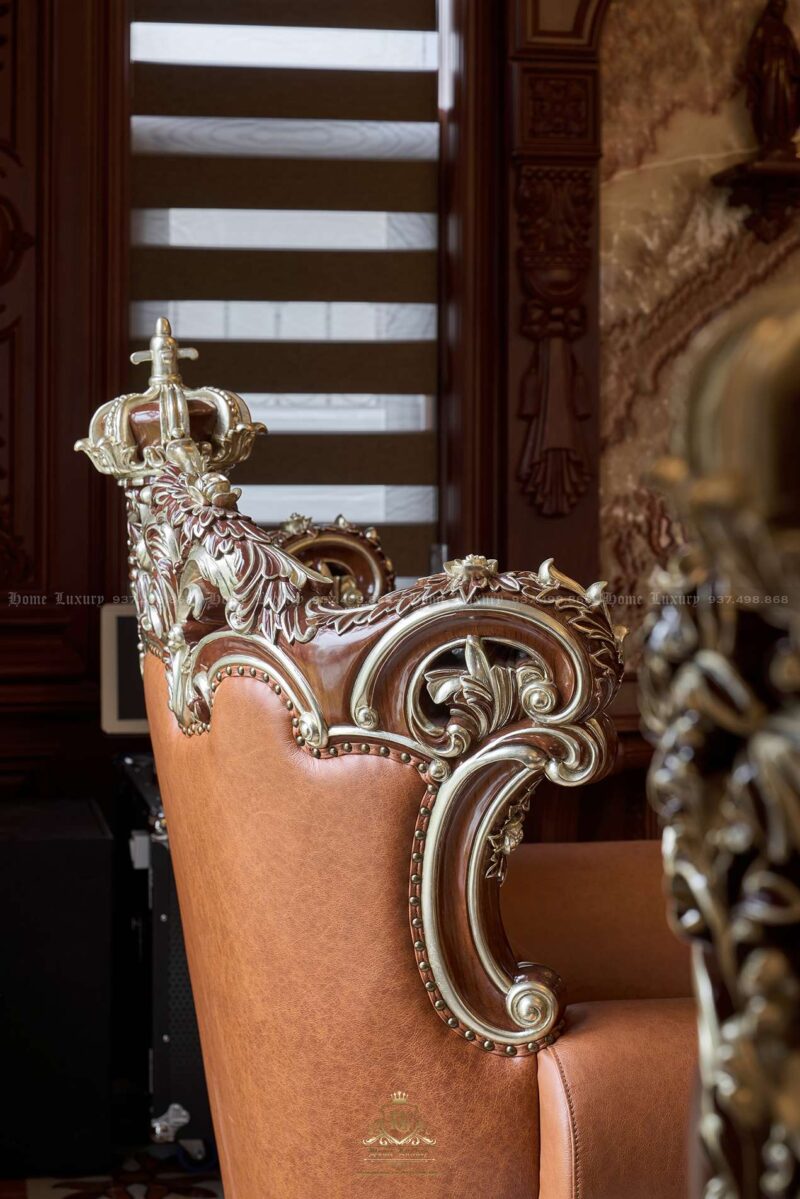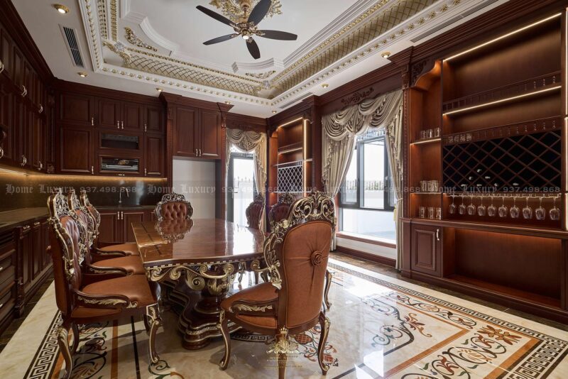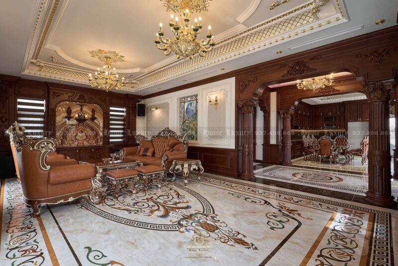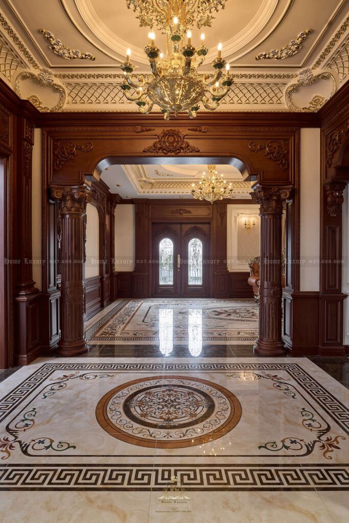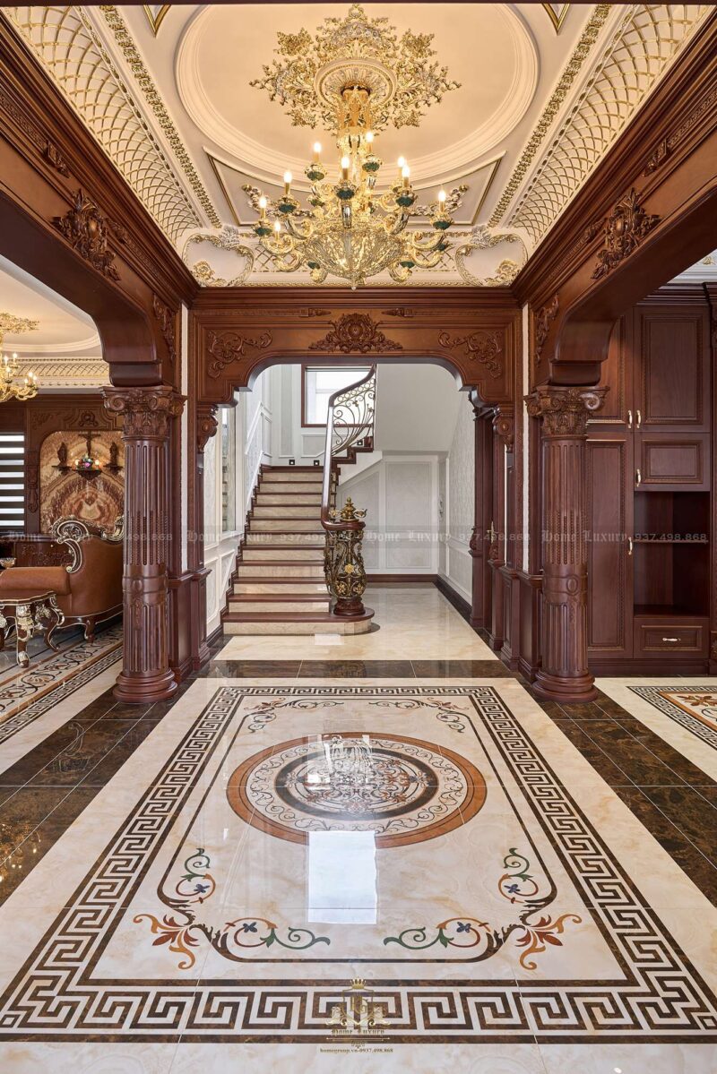 Bên trong, nội thất sử dụng gỗ tự nhiên cao cấp, chạm khắc tinh xảo từ cửa, cầu thang đến các chi tiết ốp tường. Trần nhà trang trí phào chỉ và đèn chùm mạ vàng sang trọng. Phòng khách, phòng ngủ, sảnh thang đều toát lên vẻ xa hoa, quyền quý.