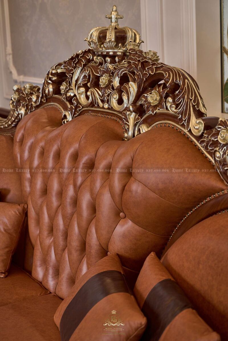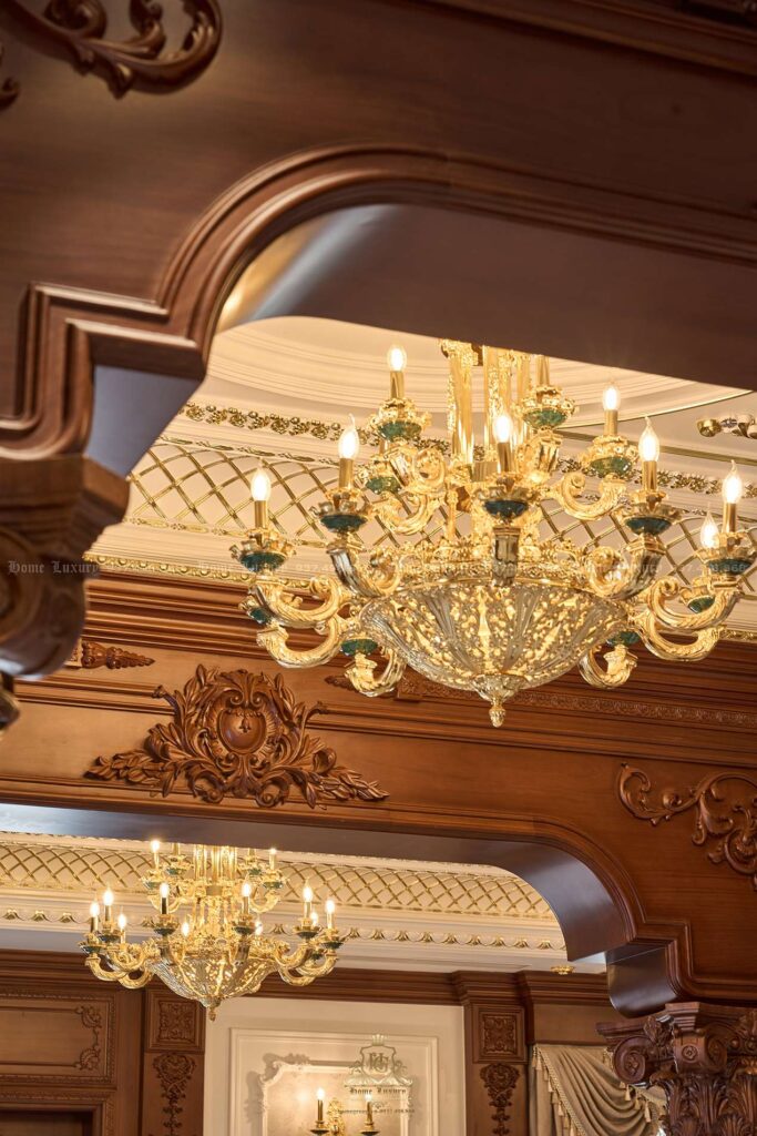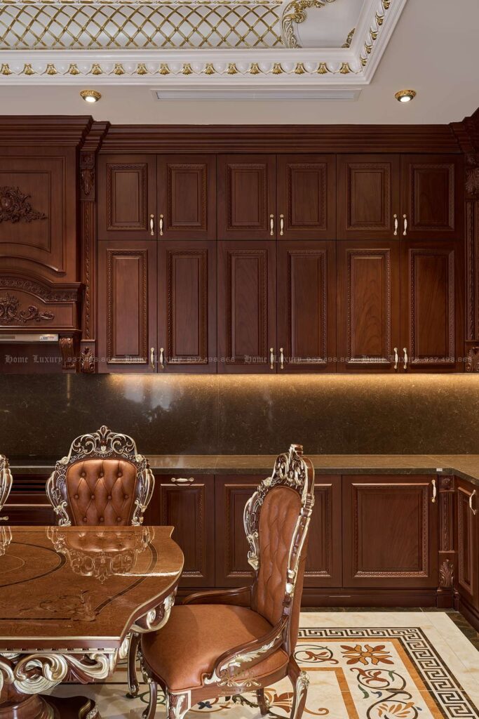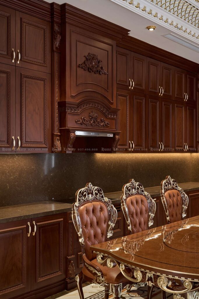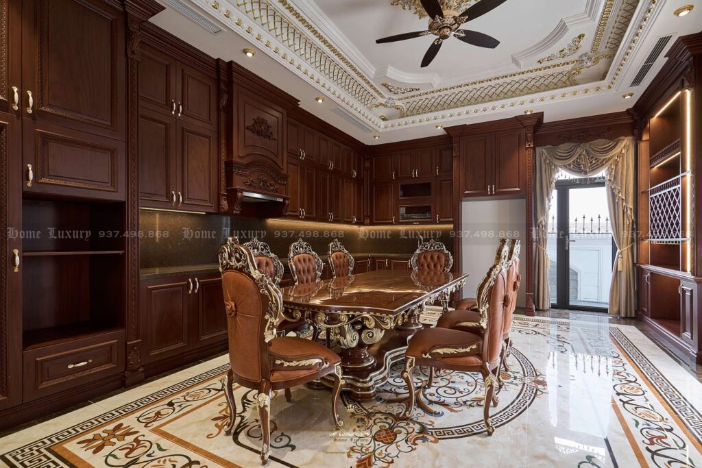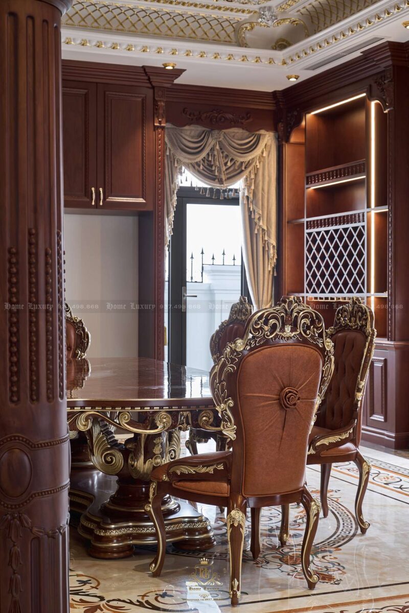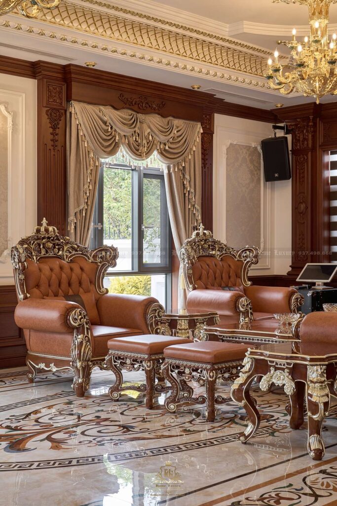 Bên trong, nội thất sử dụng gỗ tự nhiên cao cấp, chạm khắc tinh xảo từ cửa, cầu thang đến các chi tiết ốp tường. Trần nhà trang trí phào chỉ và đèn chùm mạ vàng sang trọng. Phòng khách, phòng ngủ, sảnh thang đều toát lên vẻ xa hoa, quyền quý.