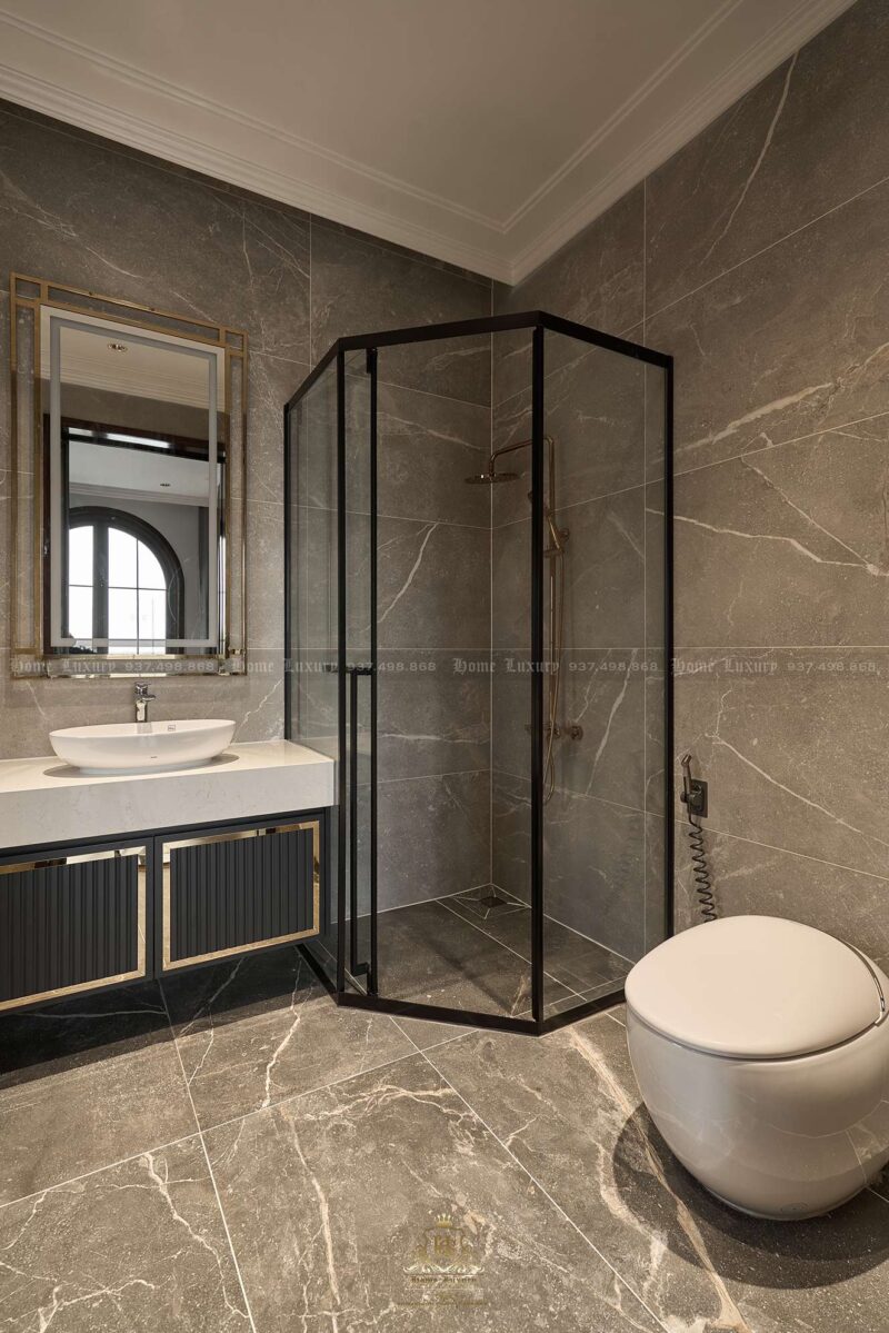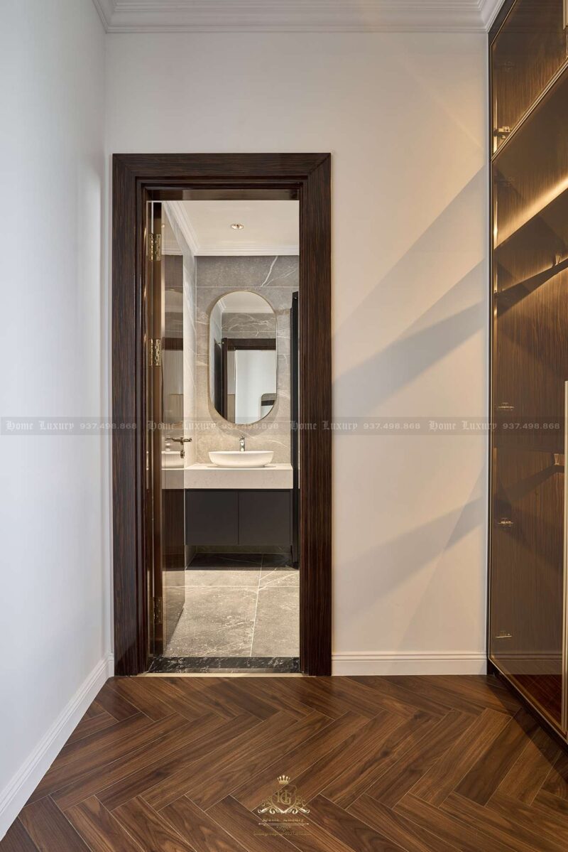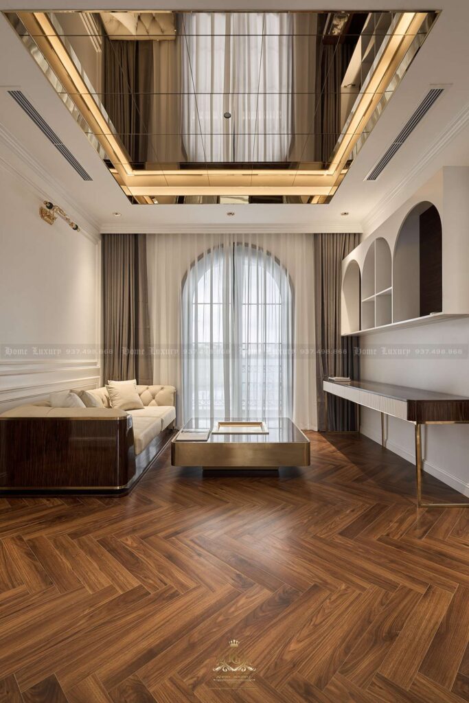 Sàn nhà lát đá hoa cương họa tiết tinh tế, kết hợp ánh sáng ấm áp, tạo nên không gian sống chuẩn mực cho giới thượng lưu, vừa bền vững vừa trường tồn với thời gian.