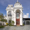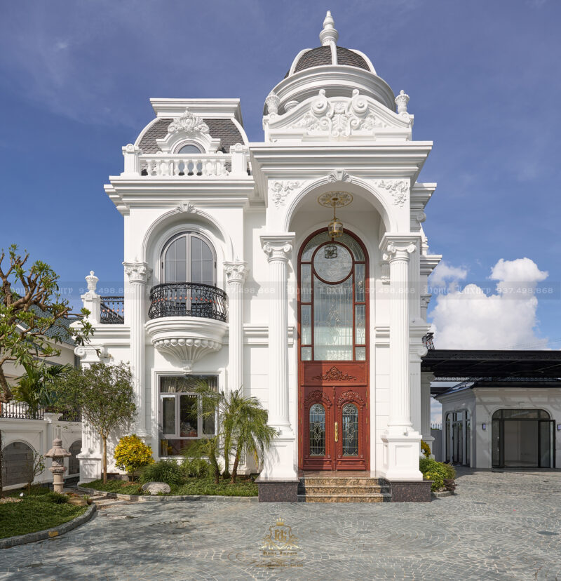 Biệt thự tân cổ điển đẳng cấp, nổi bật với mặt tiền trắng tinh tế, các chi tiết hoa văn đắp nổi cầu kỳ và hệ cột La Mã bề thế.